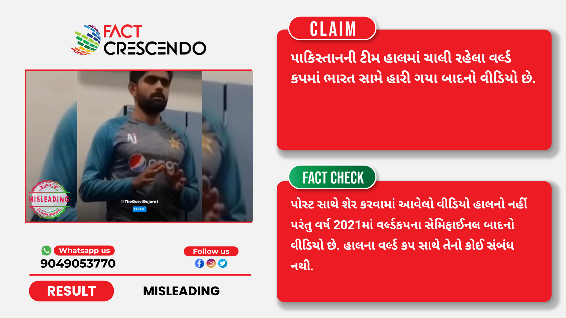 (જો તમારી પાસે પણ સોશિયલ મિડિયાના માધ્યમથી કોઈ શંકાસ્પદ મેસેજ, પોસ્ટ, ફોટો અને વિડિયો અથવા સમાચાર હોય, તો તેની સત્યતા જાણવા માટે તમે અમને અમારા વોટ્સઅપ ફેક્ટલાઈન નંબર (9049053770) પર મોકલો. અમારા લેટેસ્ટ ફેક્ટ ચેક વાંચવા માટે Facebook, Instagram અને Twitter પર Fact Crescendoને ફોલો કરો.)