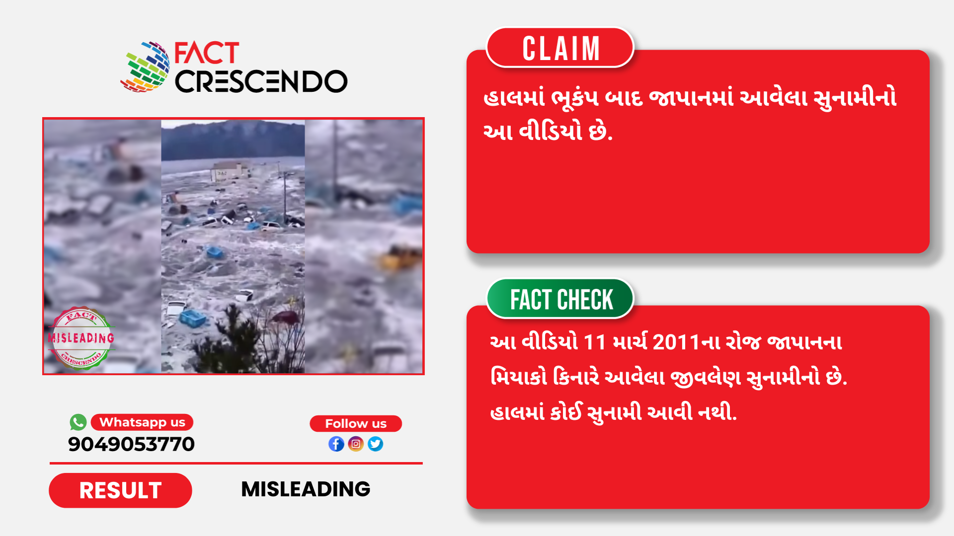 આમ, અમારી પડતાલમાં ઉપરોક્ત પોસ્ટ ખોટી સાબિત થાય છે. કારણ કે, આ વીડિયો 11 માર્ચ 2011ના રોજ જાપાનના મિયાકો કિનારે આવેલા જીવલેણ સુનામીનો છે. હાલમાં કોઈ સુનામી આવી નથી.