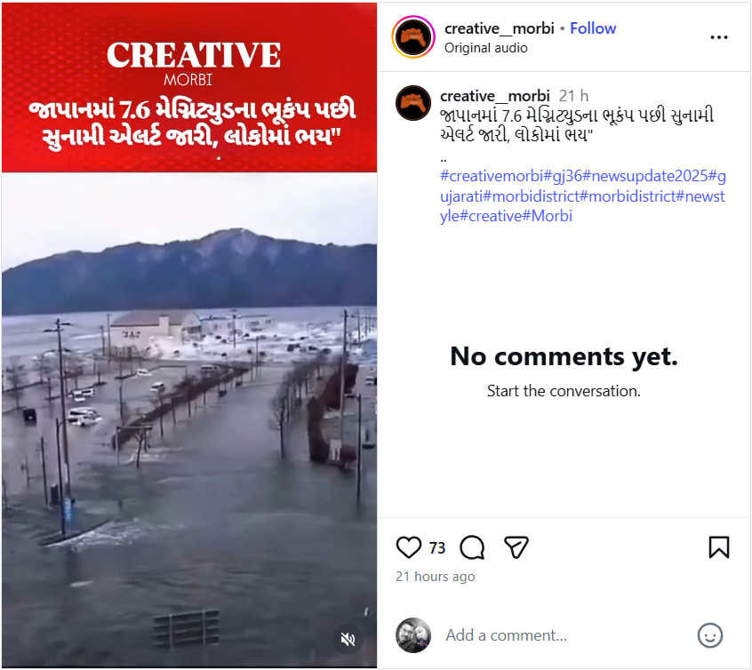 સોશિયલ મીડિયા યુઝર્સ દ્વારા તારીખ 09 ડિસેમ્બર 2025ના એક પોસ્ટ શેર કરવામાં આવી હતી. આ પોસ્ટમાં દાવો કરવામાં આવ્યો હતો કે, “હાલમાં ભૂકંપ બાદ જાપાનમાં આવેલા સુનામીનો આ વીડિયો છે.”