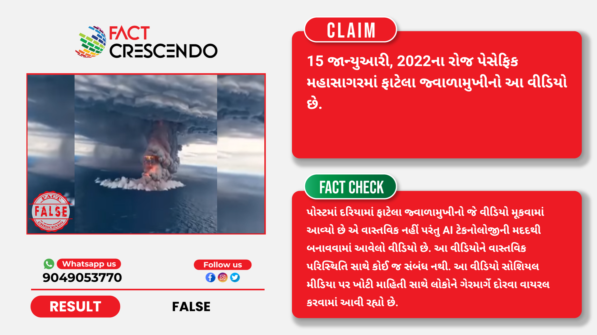 તાજેતરમાં સોશિયલ મીડિયા પર દરિયામાં ફાટેલા જ્વાળામુખીનો એક વીડિયો વાયરલ થઈ રહ્યો છે જેની સાથે એવો દાવો કરવામાં આવી રહ્યો છે કે, 15 જાન્યુઆરી, 202ના રોજ પેસેફિક મહાસાગરમાં ફાટેલા જ્વાળામુખીનો આ વીડિયો છે. પરંતુ ફેક્ટ ક્રેસેન્ડોની પડતાલમાં આ દાવો ખોટો અને પાયાવિહોણો હોવાનું સાબિત થાય છે કારણ કે, પોસ્ટમાં દરિયામાં ફાટેલા જ્વાળામુખીનો જે વીડિયો મૂકવામાં આવ્યો છે એ વાસ્તવિક નહીં પરંતુ AI ટેકનોલોજીની મદદથી બનાવવામાં આવેલો વીડિયો છે. આ વીડિયોને વાસ્તવિક પરિસ્થિતિ સાથે કોઈ જ સંબંધ નથી. આ વીડિયો સોશિયલ મીડિયા પર ખોટી માહિતી સાથે લોકોને ગેરમાર્ગે દોરવા વાયરલ કરવામાં આવી રહ્યો છે.