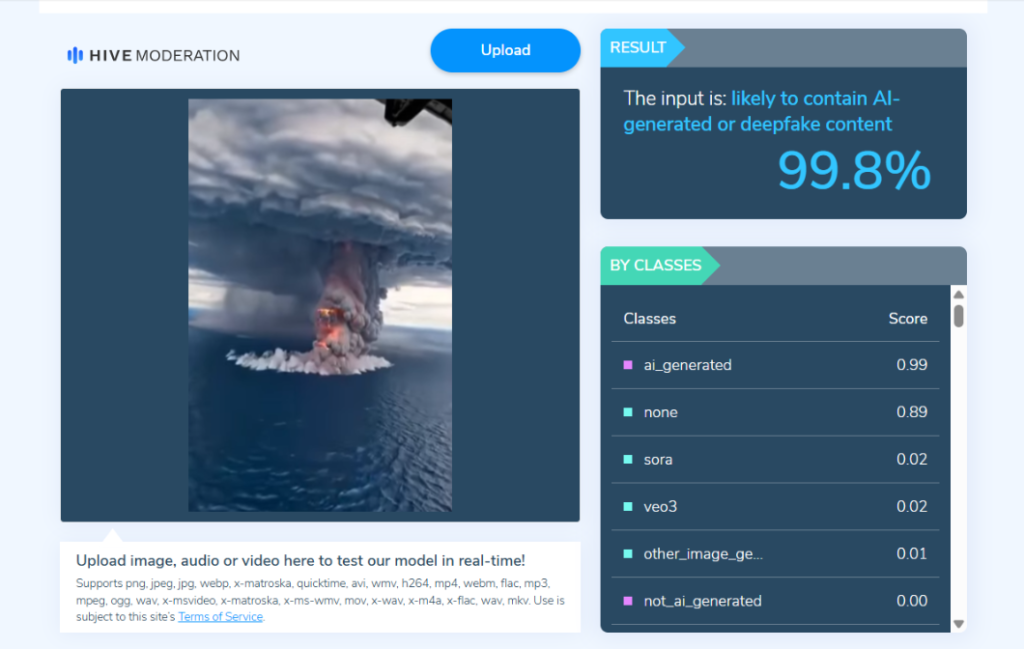 ત્યાર બાદ અમે અમારી તપાસને વધુ મજબૂત બનાવવા માટે hivemoderation.com નામની એક AI ડિટેક્ટર વેબસાઈટ પર વાયરલ વીડિયોનો એક સ્ક્રીનશોટ લઈને સર્ચ કરતાં તેમાં પણ આ વીડિયો 99.8% AI દ્વારા બનાવવામાં આવ્યો હોવાની જાણકારી પ્રાપ્ત થઈ હતી.