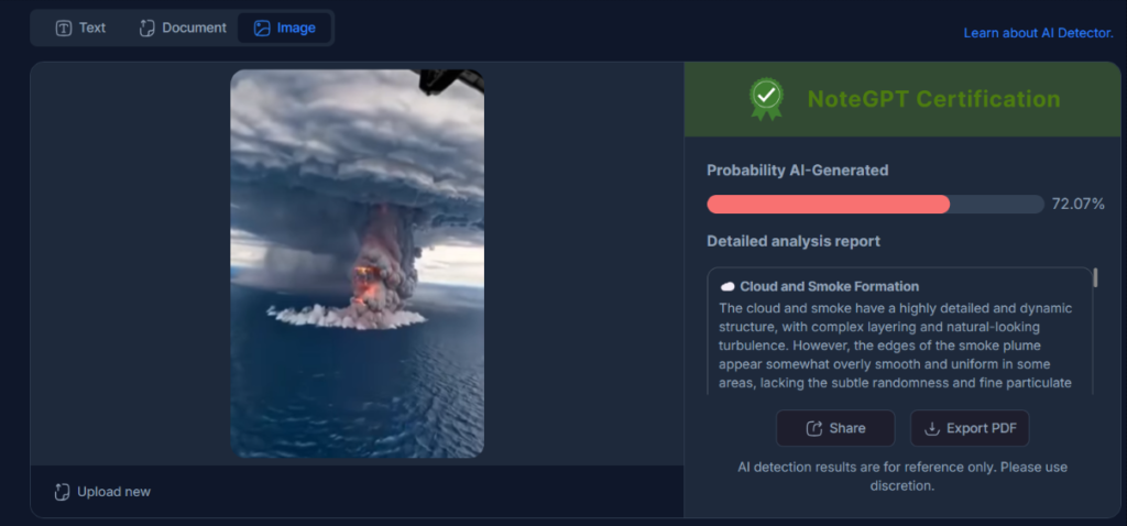 આમ, અમારી પડતાલમાં ઉપરોક્ત પોસ્ટમાં કરવામાં આવેલો દાવો અધૂરી માહિતી સાથેનો હોવાનું સાબિત થાય છે કારણ કે, પોસ્ટમાં દરિયામાં ફાટેલા જ્વાળામુખીનો જે વીડિયો મૂકવામાં આવ્યો છે એ વાસ્તવિક નહીં પરંતુ AI ટેકનોલોજીની મદદથી બનાવવામાં આવેલો વીડિયો છે. આ વીડિયોને વાસ્તવિક પરિસ્થિતિ સાથે કોઈ જ સંબંધ નથી. આ વીડિયો સોશિયલ મીડિયા પર ખોટી માહિતી સાથે લોકોને ગેરમાર્ગે દોરવા વાયરલ કરવામાં આવી રહ્યો છે.