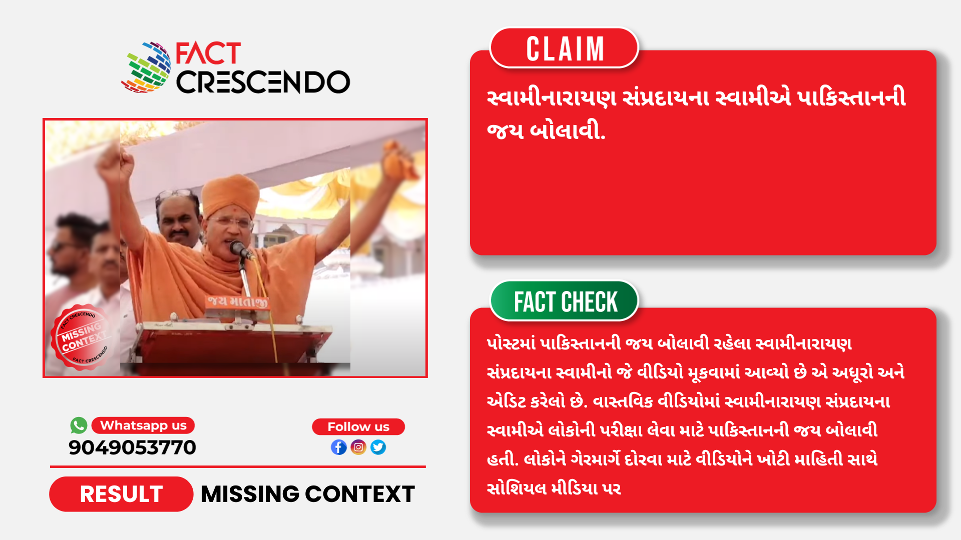 તાજેતરમાં સોશિયલ મીડિયા પર સ્વામીનારાયણ સંપ્રદાયના સ્વામીના નિવેદનનો એક વીડિયો વાયરલ થઈ રહ્યો છે જેની સાથે એવો દાવો કરવામાં આવી રહ્યો છે કે, સ્વામીનારાયણ સંપ્રદાયના સ્વામીએ પાકિસ્તાનની જય બોલાવી. પરંતુ ફેક્ટ ક્રેસેન્ડોની પડતાલમાં આ દાવો ખોટો અને પાયાવિહોણો સાબિત થાય છે કારણ કે, પોસ્ટમાં પાકિસ્તાનની જય બોલાવી રહેલા સ્વામીનારાયણ સંપ્રદાયના સ્વામીનો જે વીડિયો મૂકવામાં આવ્યો છે એ અધૂરો અને એડિટ કરેલો છે. વાસ્તવિક વીડિયોમાં સ્વામીનારાયણ સંપ્રદાયના સ્વામીએ લોકોની પરીક્ષા લેવા માટે પાકિસ્તાનની જય બોલાવી હતી. લોકોને ગેરમાર્ગે દોરવા માટે વીડિયોને ખોટી માહિતી સાથે સોશિયલ મીડિયા પર વાયરલ કરવામાં આવી રહ્યો છે.