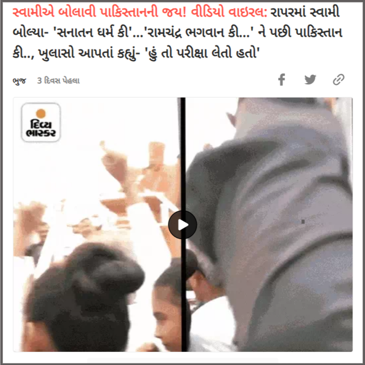 ઉપરોક્ત પોસ્ટમાં કરવામાં આવેલા દાવાની સત્યતા તપાસવી જરૂરી જણાતાં અમે અમારી પડતાલ/તપાસ કાર્યવાહી શરૂ કરી હતી. તપાસની શરૂઆતમાં અમેપોસ્ટમાં મૂકવામાં આવેલા વીડિયોને ધ્યાનથી જોયા બાદ ગુગલ રિવર્સ ઈમેજનો સહારો લઈ આ વીડિયોનો એક સ્ક્રીનશોટ લઈને સર્ચ કરતાં પોસ્ટમાં મૂકવામાં આવેલા આ જ વીડિયો સાથેના સમાચાર દિવ્યભાસ્કર દ્વારા 12 ફેબ્રુઆરી, 2024 ના રોજ પ્રસારિત કરવામાં આવ્યા હોવાની માહિતી પ્રાપ્ત થઈ હતી. જેમાં એવી માહિતી આપવામાં આવી હતી કે, રાપરના ચિત્રોડ રોડ પર આવેલા શ્રી સ્વામિનારાયણ ગુરુકુળ ખાતે ગત તા.10ના પીએમ આવાસ યોજનના ઇ- લોકાર્પણ પ્રસંગે ગુરુકુળના કેપી સ્વામીએ પોતાના પ્રવચન દરમિયાન ભારત માતા કી જય સાથે વિવિધ દેવી દેવતાઓનાં નામ બોલી ઉપસ્થિત જનસમૂહ પાસે જય બોલાવી હતી, જો કે, જયઘોષની આખરમાં સ્વામીએ પાકિસ્તાન બોલતા જ સભાએ તુરંત જય બોલાવી હતી, આ સમયે ક્ષણભર માટે સભા મંડપમાં સોપો પડી ગયો હતો. જોકે, સ્વામીએ કહ્યું હતું કે, ભારતનું અનાજ ખાવો છો, ભારતની માટી ઉપર રહો છો અને પાકિસ્તાનની જય બોલાવતા શરમ ના આવી તમને? અલબત્ત સ્વામીના રાષ્ટ્રભાવ જગાવવાના ભવાર્થનો અધૂરો વીડિયો હાલ સોશિયલ મીડિયા પર વાઇરલ થયો છે.