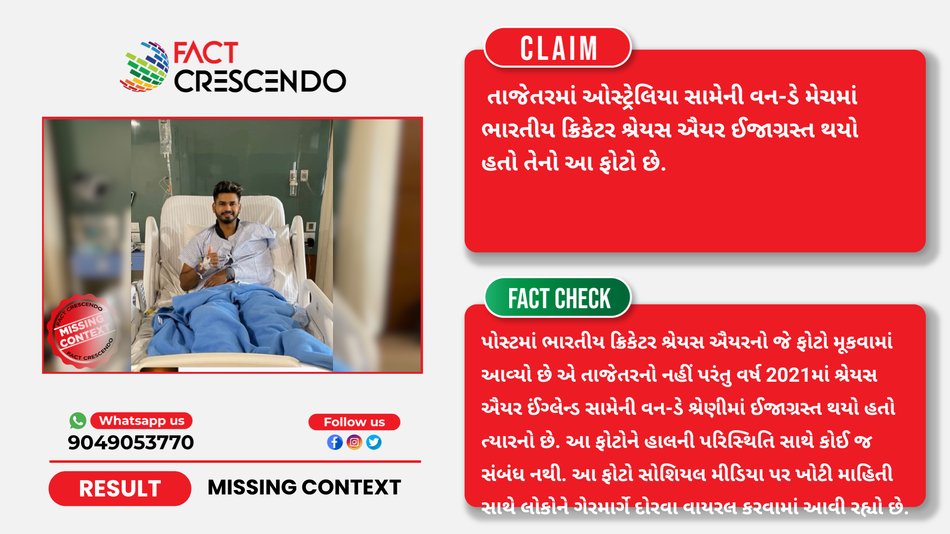 તાજેતરમાં સોશિયલ મીડિયા પર ભારતીય ક્રિકેટર શ્રેયસ ઐયરનો એક ફોટો વાયરલ થઈ રહ્યો છે જેની સાથે એવો દાવો કરવામાં આવી રહ્યો છે કે, તાજેતરમાં ઓસ્ટ્રેલિયા સામેની વન-ડે મેચમાં ભારતીય ક્રિકેટર શ્રેયસ ઐયર ઈજાગ્રસ્ત થયો હતો તેનો આ ફોટો છે. પરંતુ ફેક્ટ ક્રેસેન્ડોની પડતાલમાં આ દાવો ખોટો અને પાયાવિહોણો હોવાનું સાબિત થાય છે કારણ કે, પોસ્ટમાં ભારતીય ક્રિકેટર શ્રેયસ ઐયરનો જે ફોટો મૂકવામાં આવ્યો છે એ તાજેતરનો નહીં પરંતુ વર્ષ 2021માં શ્રેયસ ઐયર ઈંગ્લેન્ડ સામેની વન-ડે શ્રેણીમાં ઈજાગ્રસ્ત થયો હતો ત્યારનો છે. આ ફોટોને હાલની પરિસ્થિતિ સાથે કોઈ જ સંબંધ નથી. આ ફોટો સોશિયલ મીડિયા પર ખોટી માહિતી સાથે લોકોને ગેરમાર્ગે દોરવા વાયરલ કરવામાં આવી રહ્યો છે.