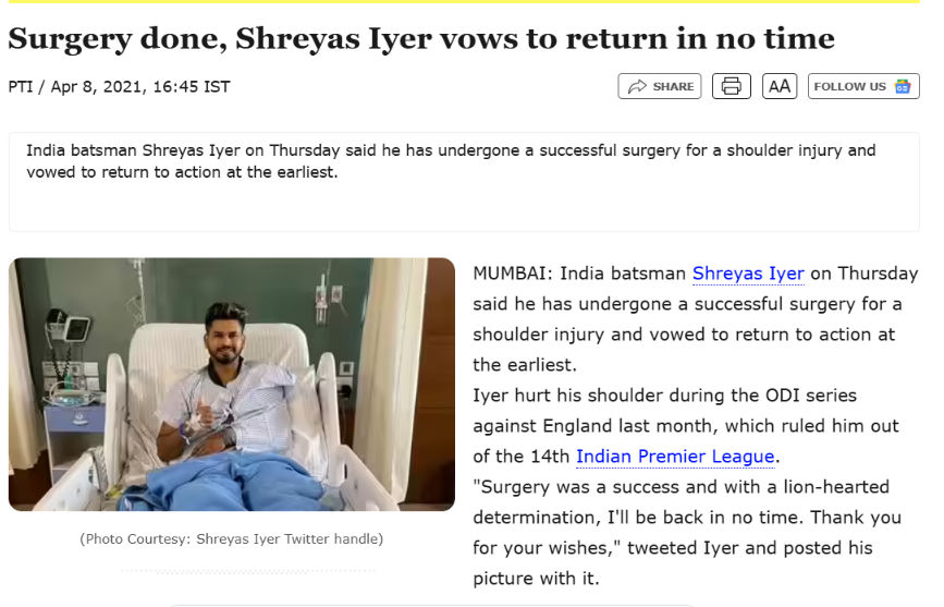 ઉપરોક્ત પોસ્ટમાં કરવામાં આવેલા દાવાની સત્યતા તપાસવી જરૂરી જણાતાં અમે અમારી પડતાલ/તપાસ કાર્યવાહી શરૂ કરી હતી. તપાસની શરુઆતમાં અમે પોસ્ટમાં મૂકવામાં આવેલા ફોટોને ગુગલ રિવર્સ ઈમેજનો સહારો લઈને સર્ચ કરતાં અમને પોસ્ટમાં મૂકવામાં આવેલા આ જ ફોટો સાથેના સમાચાર timesofindia.indiatimes.com દ્વારા 8 એપ્રિલ, 2021ના રોજ પ્રસારિત કરવામાં આવ્યા હોવાની માહિતી પ્રાપ્ત થઈ હતી. જેમાં એવી માહિતી આપવામાં આવી હતી કે,  વર્ષ 2021માં શ્રેયસ ઐયર ઈંગ્લેન્ડ સામેની વન-ડે શ્રેણીમાં ખભામાં ઈજા થઈ હતી. જેની સફળ સર્જરી થતાં શ્રેયશે જલ્દી પરત ફરવા અંગે સોશિયલ મીડિયા પર ફોટો સાથે પોસ્ટ કરી હતી.