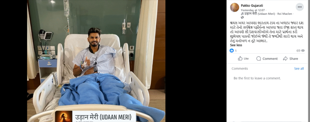 એક સોશિયલ મીડિયા યુઝર દ્વારા 28 ઓક્ટોબર, 2025ના રોજ એક પોસ્ટ શેર કરવામાં આવી હતી. પોસ્ટમાં મૂકવામાં આવેલા ફોટોના શીર્ષકમાં એવું લખવામાં આવ્યું છે કે, શ્રેયસ ઐયર આપણા ભારતીય ટીમ નો ખેલાડી જ્યારે દેશ માટે તેનો સર્વશ્રેષ્ઠ પર્ફોર્મન્સ આપવા જતા ઈજા ગ્રસ્ત થાય તો આપણે સૌ દેશવાસીઓએ તેના માટે પ્રાર્થના કરી શુભેચ્છા પાઠવી જોઈએ જેથી તે જલ્દીથી સારો થાય અને તેનું મનોબળ ન તૂટે આભાર… આ ફોટો સાથેના લખાણમાં એવો દાવો કરવામાં આવી રહ્યો છે કે, તાજેતરમાં ઓસ્ટ્રેલિયા સામેની વન-ડે મેચમાં ભારતીય ક્રિકેટર શ્રેયસ ઐયર ઈજાગ્રસ્ત થયો હતો તેનો આ ફોટો છે.