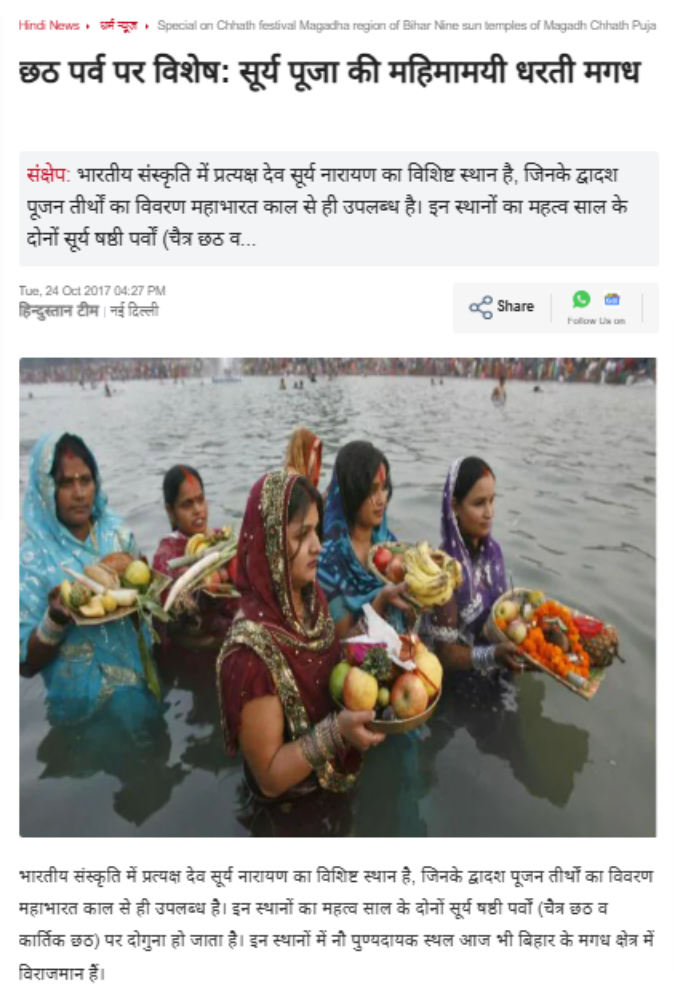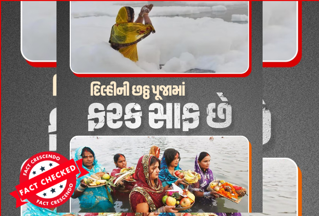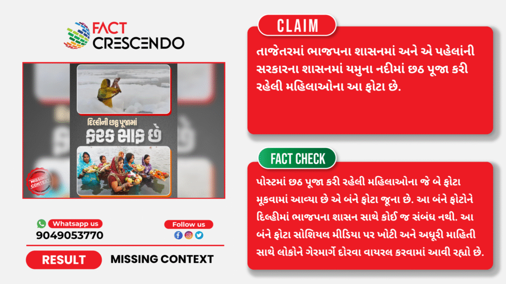 તાજેતરમાં સોશિયલ મીડિયા પર છઠ પૂજા કરી રહેલી મહિલાઓના બે ફોટા વાયરલ થઈ રહ્યો છે જેની સાથે એવો દાવો કરવામાં આવી રહ્યો છે કે, તાજેતરમાં ભાજપના શાસનમાં અને એ પહેલાંની સરકારના શાસનમાં યમુના નદીમાં છઠ પૂજા કરી રહેલી મહિલાઓના આ ફોટા છે. પરંતુ ફેક્ટ ક્રેસેન્ડોની પડતાલમાં આ દાવો ખોટો અને પાયાવિહોણો હોવાનું સાબિત થાય છે કારણ કે, પોસ્ટમાં છઠ પૂજા કરી રહેલી મહિલાઓના જે બે ફોટા મૂકવામાં આવ્યા છે એ બંને ફોટા જૂના છે. આ બંને ફોટોને દિલ્હીમાં ભાજપના શાસન સાથે કોઈ જ સંબંધ નથી. આ બંને ફોટા સોશિયલ મીડિયા પર ખોટી અને અધૂરી માહિતી સાથે લોકોને ગેરમાર્ગે દોરવા વાયરલ કરવામાં આવી રહ્યો છે.