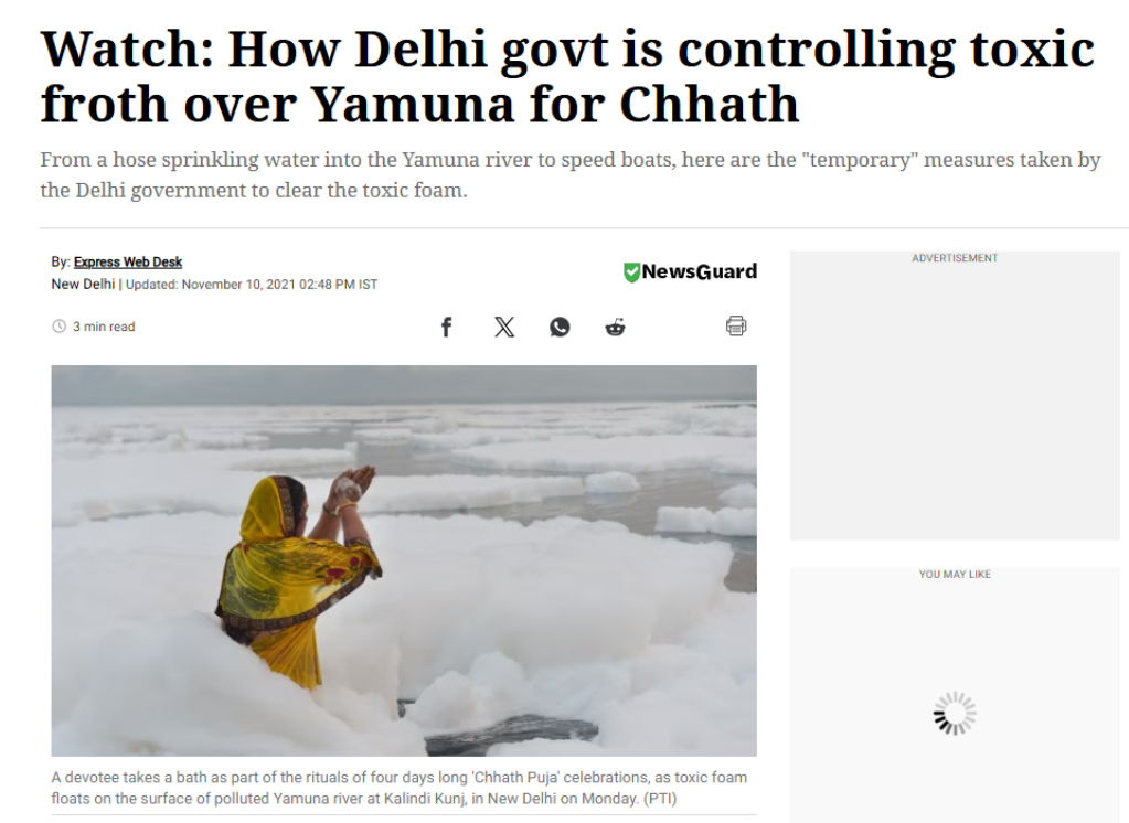 ઉપરોક્ત પોસ્ટમાં કરવામાં આવેલા દાવાની સત્યતા તપાસવી જરૂરી જણાતાં અમે અમારી પડતાલ/તપાસ કાર્યવાહી શરૂ કરી હતી. તપાસની શરુઆતમાં અમે પોસ્ટમાં મૂકવામાં આવેલા પ્રથમ ફોટોને ગુગલ રિવર્સ ઈમેજનો સહારો લઈને સર્ચ કરતાં અમને પોસ્ટમાં મૂકવામાં આવેલા આ જ ફોટો સાથેના સમાચાર indianexpress.com દ્વારા 10 નવેમ્બર, 2021ના રોજ પ્રસારિત કરવામાં આવ્યા હોવાની માહિતી પ્રાપ્ત થઈ હતી. જેમાં એવી માહિતી આપવામાં આવી હતી કે, દિલ્હી સરકાર છઠ પૂજાની ઉજવણી માટે યમુના નદીમાં ફેલાયેલા ફીણને કઈ રીતે કંટ્રોલ કરશે. જેના પરથી એ સ્પષ્ટ સાબિત થાય છે કે, આ ફોટો જૂનો છે ત્યારે દિલ્હીમાં આમ આદમી પાર્ટીની સરકાર હતી.