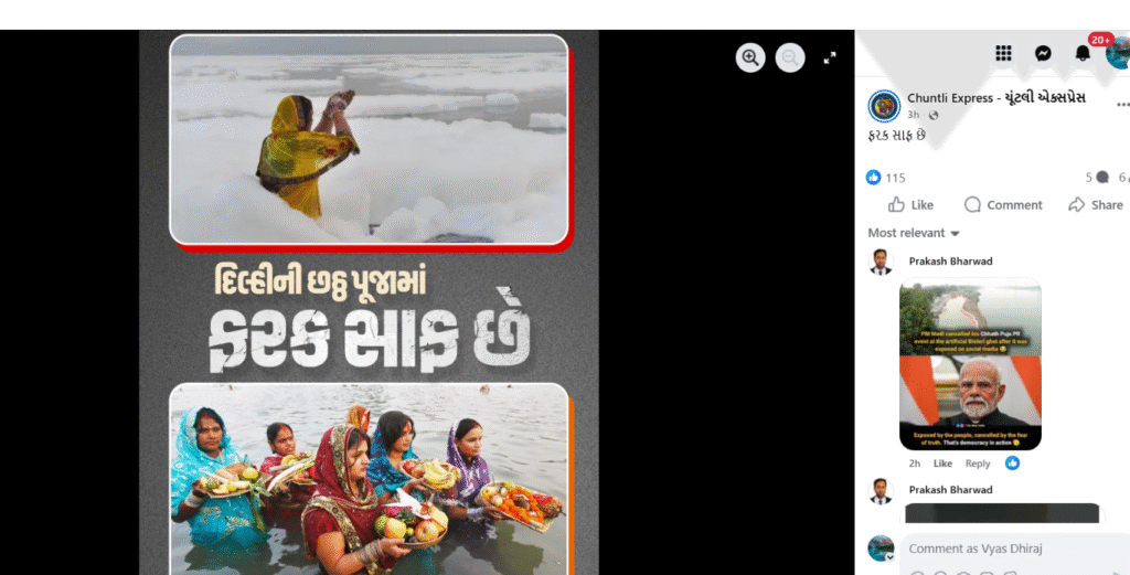 એક સોશિયલ મીડિયા યુઝર દ્વારા 28 ઓક્ટોબર, 2025ના રોજ એક પોસ્ટ શેર કરવામાં આવી હતી. પોસ્ટમાં મૂકવામાં આવેલા ફોટોના શીર્ષકમાં એવું લખવામાં આવ્યું છે કે, ફરક સાફ છે. આ ફોટો સાથેના લખાણમાં એવો દાવો કરવામાં આવી રહ્યો છે કે, તાજેતરમાં ભાજપના શાસનમાં અને એ પહેલાંની સરકારના શાસનમાં યમુના નદીમાં છઠ પૂજા કરી રહેલી મહિલાઓના આ ફોટા છે.