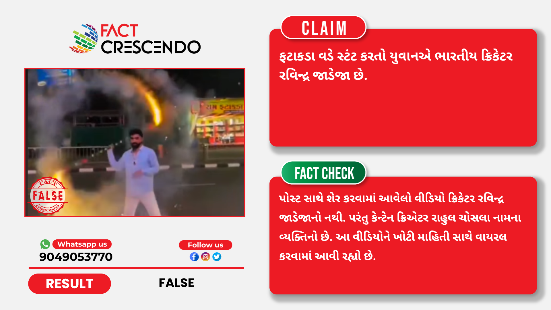 આમ, અમારી પડતાલમાં ઉપરોક્ત પોસ્ટ ખોટી સાબિત થાય છે. કારણ કે, પોસ્ટ સાથે શેર કરવામાં આવેલો વીડિયો ક્રિકેટર રવિન્દ્ર જાડેજાનો નથી. પરંતુ કેન્ટેન ક્રિએટર રાહુલ ચોસલા નામના વ્યક્તિનો છે. આ વીડિયોને ખોટી માહિતી સાથે વાયરલ કરવામાં આવી રહ્યો છે.