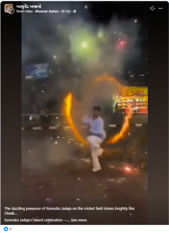 ભારતીય ક્રિકેટર રવિન્દ્ર જાડેજા ઘણીવાર મેદાન પર પોતાના બેટને તલવારની જેમ લહેરાવીને ઉજવણી કરતો જોવા મળે છે. આ સંદર્ભમાં, સોશિયલ મીડિયા પર એક વ્યક્તિનો ફટાકડાના કરતબ કરતો વીડિયો ઝડપથી વાયરલ થઈ રહ્યો છે. આ વીડિયોને શેર કરીને દાવો કરવામાં આવી રહ્યો છે કે, “ફટાકડા વડે સ્ટંટ કરતો યુવાનએ ભારતીય ક્રિકેટર રવિન્દ્ર જાડેજા છે.”