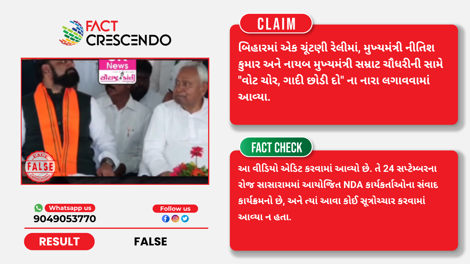 સોશિયલ મીડિયા યુઝર્સ દ્વારા તારીખ 07 ઓક્ટોબર 2025ના એક પોસ્ટ શેર કરવામાં આવી હતી. આ પોસ્ટમાં દાવો કરવામાં આવ્યો હતો કે, “બિહારમાં એક ચૂંટણી રેલીમાં, મુખ્યમંત્રી નીતિશ કુમાર અને નાયબ મુખ્યમંત્રી સમ્રાટ ચૌધરીની સામે “વોટ ચોર, ગાદી છોડી દો” ના નારા લગાવવામાં આવ્યા.”
