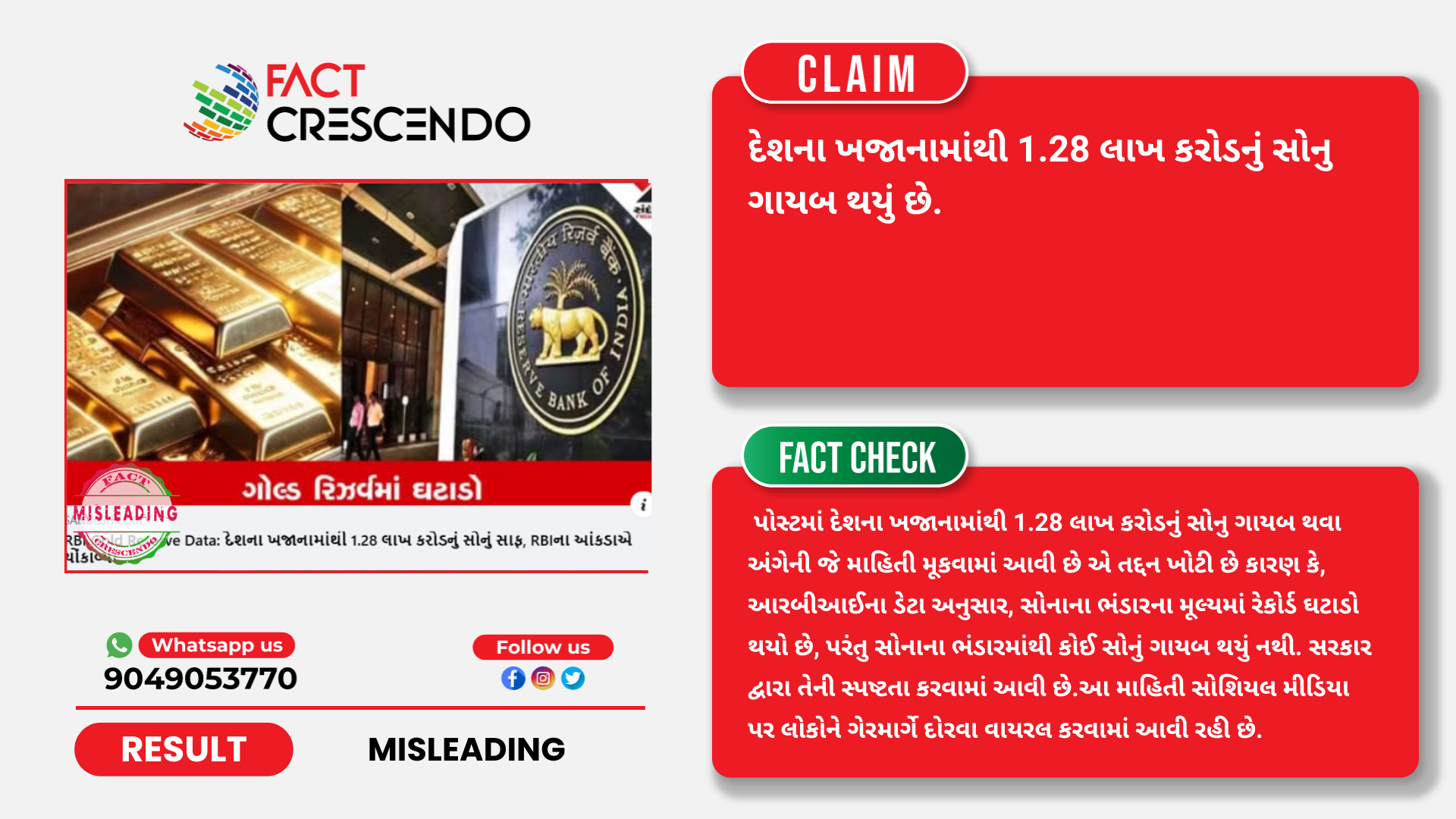 તાજેતરમાં સોશિયલ મીડિયા પર સંદેશનો એક સમાચાર અહેવાલ વાયરલ થઈ રહ્યો છે. આ અહેવાલ સાથેના લખાણમાં એવો દાવો કરવામાં આવી રહ્યો છે કે, દેશના ખજાનામાંથી 1.28 લાખ કરોડનું સોનુ ગાયબ થયું છે પરંતુ ફેક્ટ ક્રેસેન્ડોની પડતાલમાં આ દાવો ખોટો અને ભ્રામક હોવાનું સાબિત થાય છે કારણ કે, પોસ્ટમાં દેશના ખજાનામાંથી 1.28 લાખ કરોડનું સોનુ ગાયબ થવા અંગેની જે માહિતી મૂકવામાં આવી છે એ તદ્દન ખોટી છે કારણ કે, આરબીઆઈના ડેટા અનુસાર, સોનાના ભંડારના મૂલ્યમાં રેકોર્ડ ઘટાડો થયો છે, પરંતુ સોનાના ભંડારમાંથી કોઈ સોનું ગાયબ થયું નથી. સરકાર દ્વારા તેની સ્પષ્ટતા કરવામાં આવી છે.આ માહિતી સોશિયલ મીડિયા પર લોકોને ગેરમાર્ગે દોરવા વાયરલ કરવામાં આવી રહી છે.