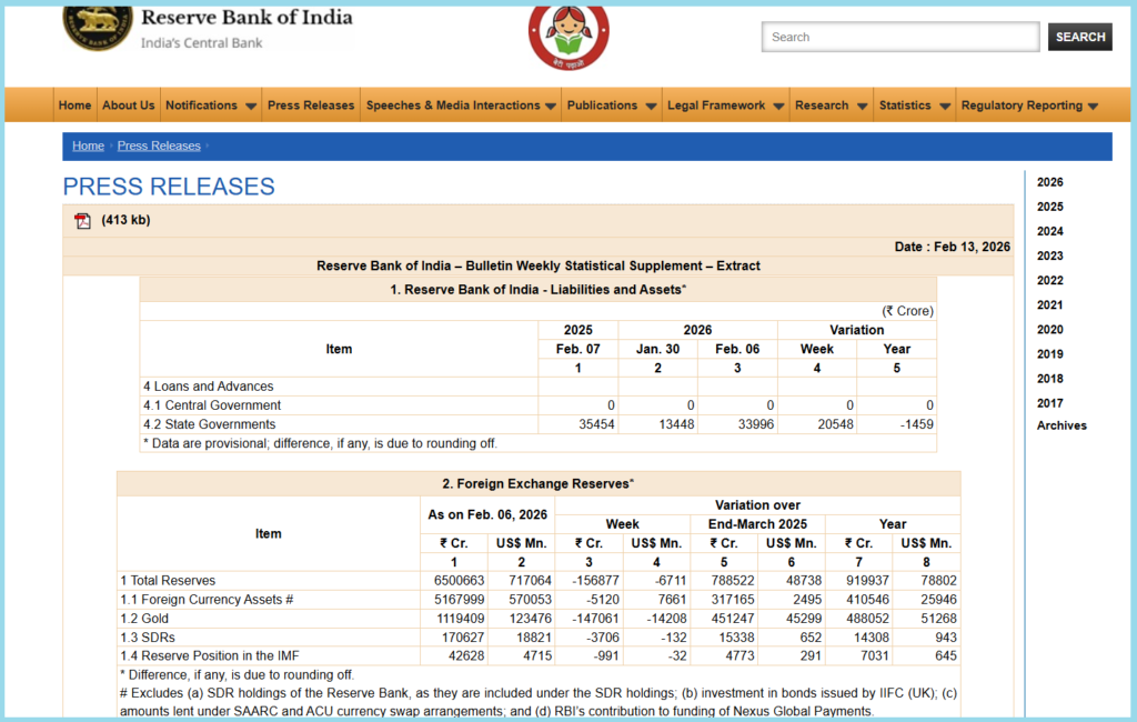 અમને ભારતીય રિઝર્વ બેંકની સત્તાવાર વેબસાઇટ પર 6 ફેબ્રુઆરી, 2026 અને 13 ફેબ્રુઆરી, 2026ના રોજ બે પ્રેસ રિલીઝ મળી. જેમાં પૂરા પાડવામાં આવેલા ડેટા અનુસાર, સોનાનો ભંડાર હાલમાં $123.476 બિલિયન હતો; જે પાછલા અઠવાડિયા કરતા $14.207 બિલિયન ઓછો છે.
