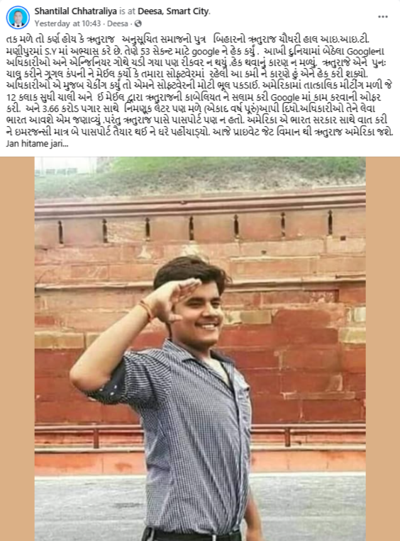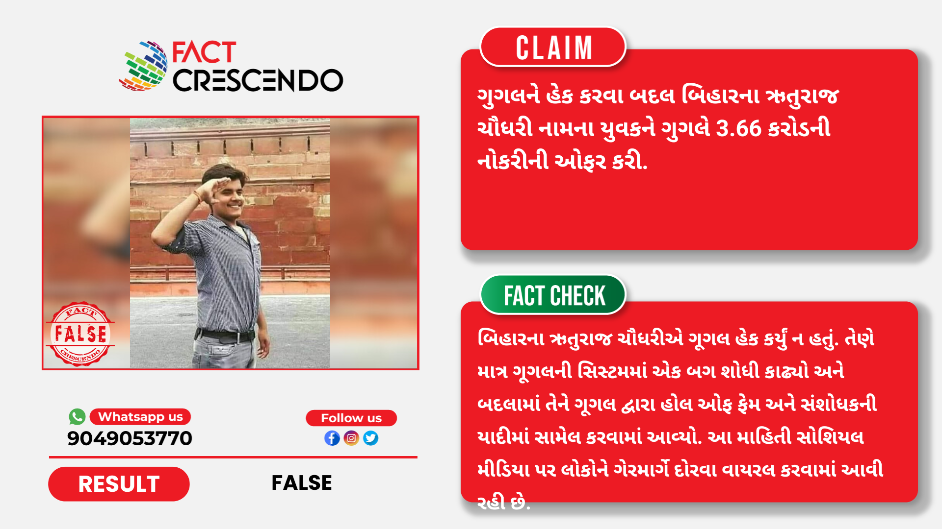 તાજેતરમાં સોશિયલ મીડિયા પર એક યુવકનો ફોટો વાયરલ થઈ રહ્યો છે. આ ફોટો સાથે એવો દાવો કરવામાં આવી રહ્યો છે કે, ગુગલને હેક કરવા બદલ બિહારના ઋતુરાજ ચૌધરી નામના યુવકને ગુગલે 3.66 કરોડની નોકરીની ઓફર કરી.