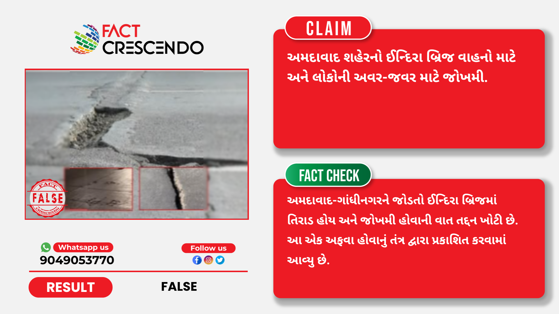 આમ, અમારી પડતાલમાં ઉપરોક્ત પોસ્ટ ખોટી સાબિત થાય છે. અમદાવાદ-ગાંધીનગરને જોડતો ઈન્દિરા બ્રિજમાં તિરાડ હોય અને જોખમી હોવાની વાત તદ્દન ખોટી છે. આ એક અફવા હોવાનું તંત્ર દ્વારા પ્રકાશિત કરવામાં આવ્યુ છે.