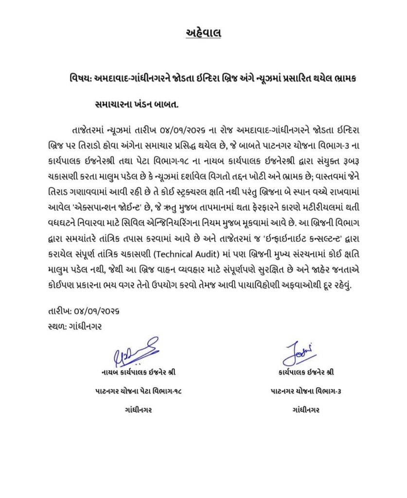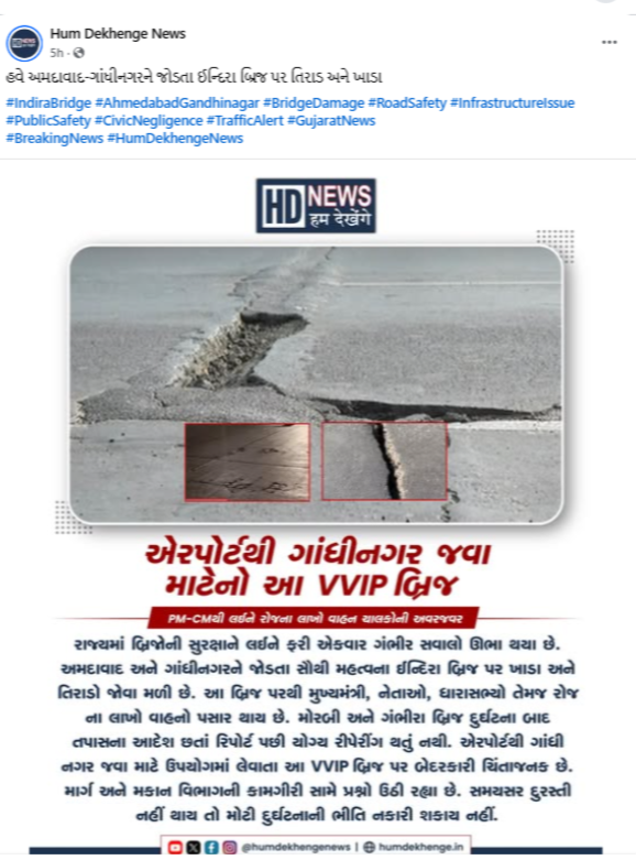 સોશિયલ મીડિયા યુઝર્સ તારીખ 04 જાન્યુઆરી 2026ના એક પોસ્ટ શેર કરવામાં આવી હતી. આ પોસ્ટમાં દાવો કરવામાં આવ્યો હતો કે, “અમદાવાદ શહેરનો ઈન્દિરા બ્રિજ વાહનો માટે અને લોકોની અવર-જવર માટે જોખમી.”
