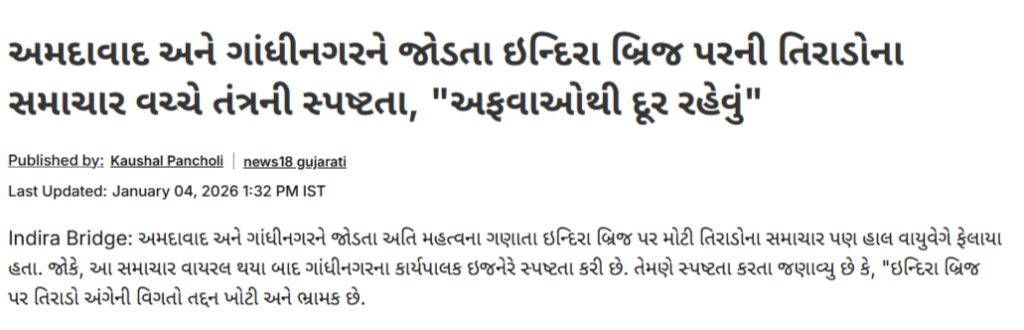 તેમજ વધુ સર્ચ કરતા અમને ન્યુઝ 18 દ્વારા પ્રસારિત કરવામાં આવેલો અહેવાલ પ્રાપ્ત થયો હતો. જેની સાથે માહિતી આપવામાં આવી હતી કે, “અમદાવાદ અને ગાંધીનગરને જોડતા અતિ મહત્વના ગણાતા ઇન્દિરા બ્રિજ પર મોટી તિરાડોના સમાચાર પણ હાલ વાયુવેગે ફેલાયા હતા. જોકે, આ સમાચાર વાયરલ થયા બાદ ગાંધીનગરના કાર્યપાલક ઇજનેરે સ્પષ્ટતા કરી છે. તેમણે સ્પષ્ટતા કરતા જણાવ્યુ છે કે, “ઇન્દિરા બ્રિજ પર તિરાડો અંગેની વિગતો તદ્દન ખોટી અને ભ્રામક છે.”