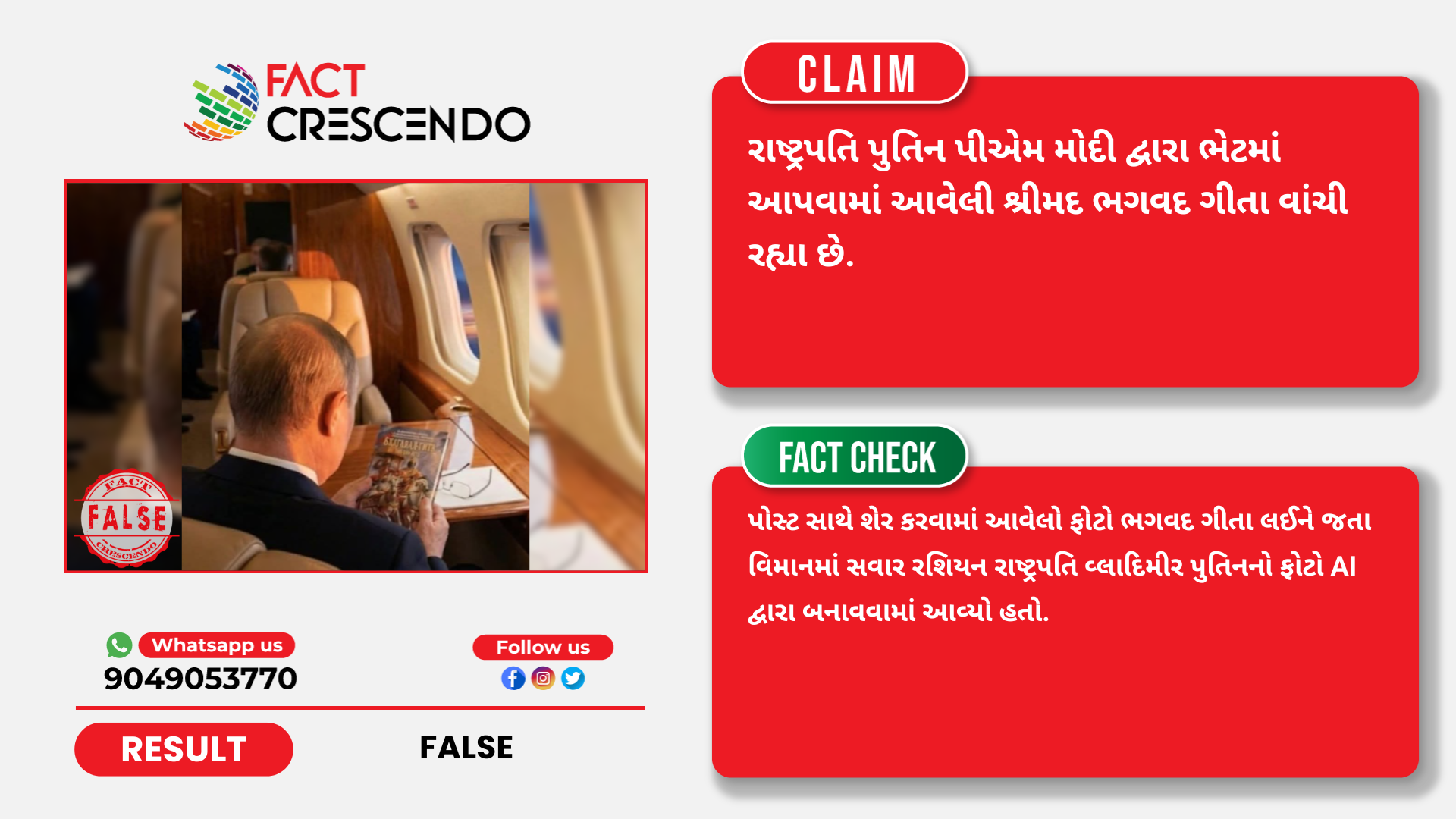 આમ, અમારી પડતાલમાં ઉપરોક્ત પોસ્ટ ખોટી સાબિત થાય છે. કારણ કે, પોસ્ટ સાથે શેર કરવામાં આવેલો ફોટો ભગવદ ગીતા લઈને જતા વિમાનમાં સવાર રશિયન રાષ્ટ્રપતિ વ્લાદિમીર પુતિનનો ફોટો AI દ્વારા બનાવવામાં આવ્યો હતો.