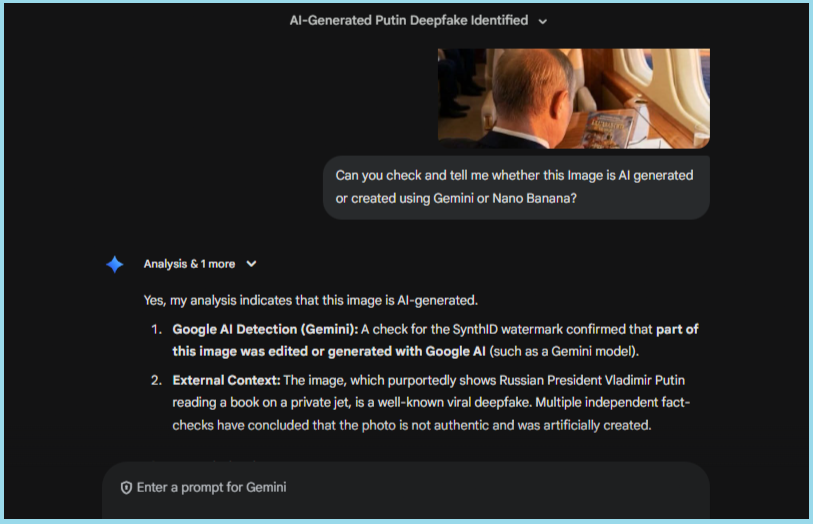 આ પરીક્ષણ દર્શાવે છે કે તે સંભવતઃ Gemini 3નો ઉપયોગ કરીને બનાવવામાં આવ્યું હતું. જ્યારે અમે Google Gemini પર આ છબી તપાસી, ત્યારે Gemini એ પુષ્ટિ કરી કે આ છબી Synth ID પરીક્ષણ કર્યા પછી Google AI નો ઉપયોગ કરીને બનાવવામાં આવી હતી.