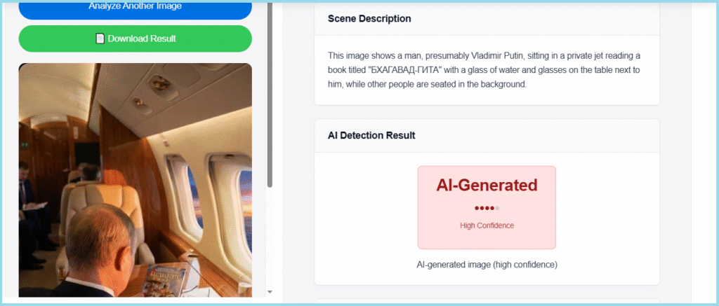 વધુમાં, કોઈ રશિયન કે આંતરરાષ્ટ્રીય મીડિયાએ આ છબી પ્રકાશિત કરી નથી. તે જ સમયે, જ્યારે ચિત્રની નજીકથી તપાસ કરવામાં આવી, ત્યારે અમને ઘણા ચિહ્નો મળ્યા જે સામાન્ય રીતે AI-જનરેટેડ છબીઓ સાથે સંકળાયેલા હતા. અકુદરતી લાઇટિંગ, અસંગત પડછાયાઓ, પુતિનની આંગળીઓની આસપાસ વિકૃતિઓ અને પુસ્તકના કવર પર મેળ ખાતી વિગતો. આપણે પુસ્તકની ટોચ પર પુસ્તકની નીચે હોવી જોઈએ તે આંગળી જોઈ શકીએ છીએ. AI નો ઉપયોગ કરીને બનાવવામાં આવેલી છબીઓમાં આવી વિસંગતતાઓ સામાન્ય છે.
