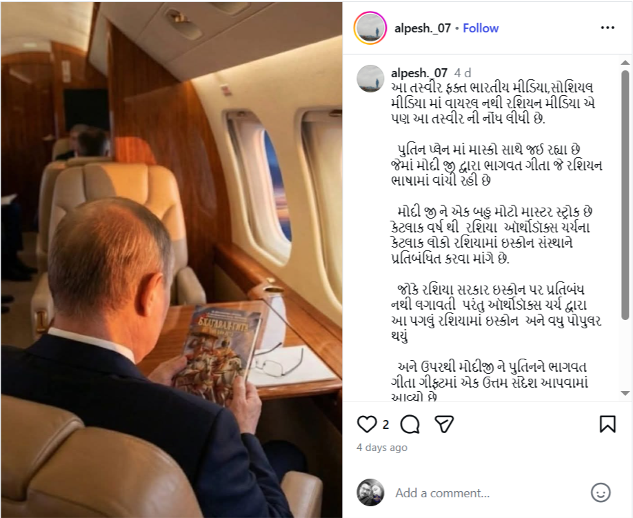 પ્રધાનમંત્રી નરેન્દ્ર મોદીએ રશિયાના રાષ્ટ્રપતિ વ્લાદિમીર પુતિનને ભગવદ ગીતાના રશિયન અનુવાદની એક નકલ ભેટમાં આપી હતી, જે બે દિવસની રાજ્ય મુલાકાત માટે ભારત આવ્યા હતા. આ પૃષ્ઠભૂમિમાં, સોશિયલ મીડિયા પર એક તસવીર વાયરલ થઈ રહી છે જેમાં રશિયાના રાષ્ટ્રપતિ વ્લાદિમીર પુતિન વિમાનમાં ભગવદ ગીતા સાથે બેઠેલા હોવાનો દાવો કરવામાં આવી રહ્યો છે.