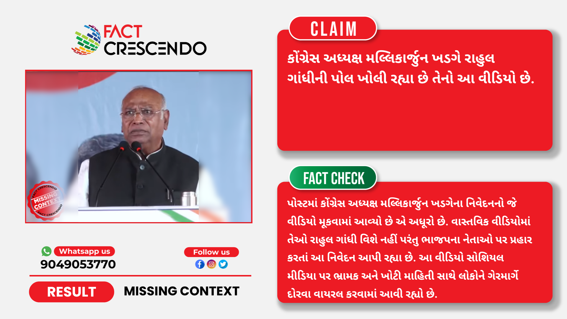 તાજેતરમાં સોશિયલ મીડિયા પર કોંગ્રેસ અધ્યક્ષ મલ્લિકાર્જુન ખડગેના નિવેદનનો એક વીડિયો વાયરલ થઈ રહ્યો છે જેની સાથે એવો દાવો કરવામાં આવી રહ્યો છે કે, કોંગ્રેસ અધ્યક્ષ મલ્લિકાર્જુન ખડગે રાહુલ ગાંધીની પોલ ખોલી રહ્યા છે તેનો આ વીડિયો છે. પરંતુ ફેક્ટ ક્રેસેન્ડોની પડતાલમાં આ દાવો ખોટો અને પાયાવિહોણો સાબિત થાય છે કારણ કે, પોસ્ટમાં કોંગ્રેસ અધ્યક્ષ મલ્લિકાર્જુન ખડગેના નિવેદનનો જે વીડિયો મૂકવામાં આવ્યો છે એ અધૂરો છે. વાસ્તવિક વીડિયોમાં તેઓ રાહુલ ગાંધી વિશે નહીં પરંતુ ભાજપના નેતાઓ પર પ્રહાર કરતાં આ નિવેદન આપી રહ્યા છે. આ વીડિયો સોશિયલ મીડિયા પર ભ્રામક અને ખોટી માહિતી સાથે લોકોને ગેરમાર્ગે દોરવા વાયરલ કરવામાં આવી રહ્યો છે.