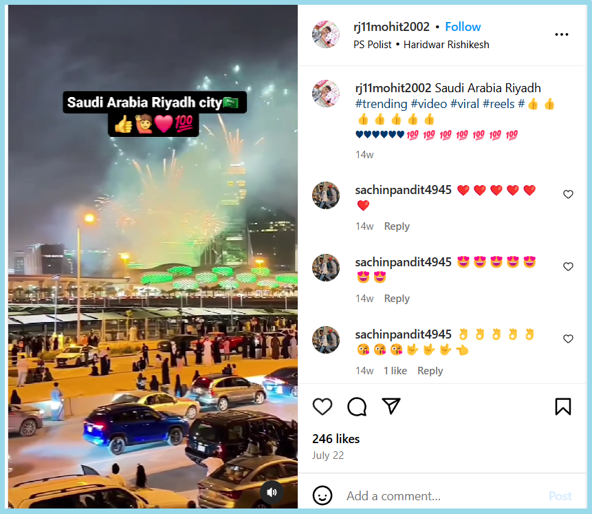 આગળ વધતાં, અમને 27 ઑગસ્ટ 2024ના રોજ ઇન્સ્ટાગ્રામ હેન્ડલ પર અપલોડ કરવામાં આવેલો એ જ વીડિયો મળ્યો, જે સાઉદી નેશનલ ડે, 2024ની પૂર્વેનો છે.