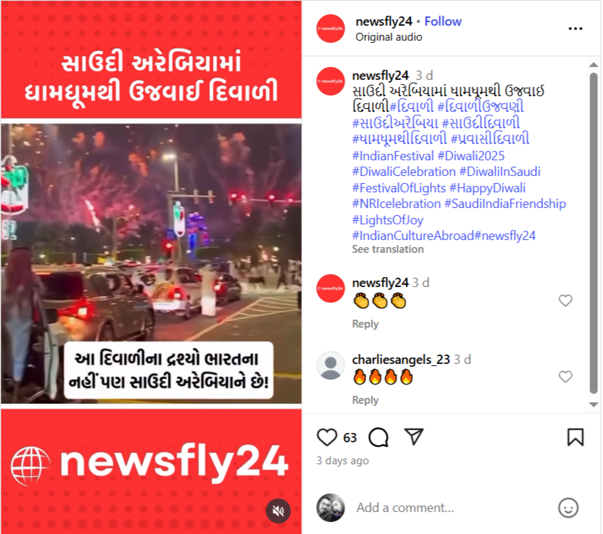 સોશિયલ મીડિયા યુઝર્સ દ્વારા તારીખ 22 ઓક્ટોબર 2025ના એક પોસ્ટ શેર કરવામાં આવી હતી. આ પોસ્ટમાં દાવો કરવામાં આવ્યો હતો કે, “સાઉદી અરેબિયામાં દિવાળીના તહેવારની ઉજવણી કરવામાં આવી તેનો વીડિયો છે.”