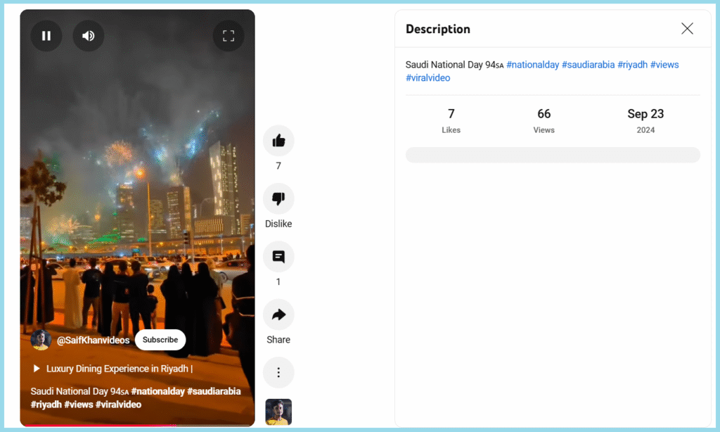 ઉપરોક્ત પરિણામો પરથી અમને એક યુટ્યુબ ચેનલ પર લઈ ગયા જ્યાં 23 સપ્ટેમ્બર 2024ના રોજ વાયરલ વીડિયો અપલોડ કરવામાં આવ્યો હતો. જેની સાથે માહિતી આપવામાં આવી હતી કે, વીડિયો 94માં સાઉદી નેશનલ ડેનો છે.