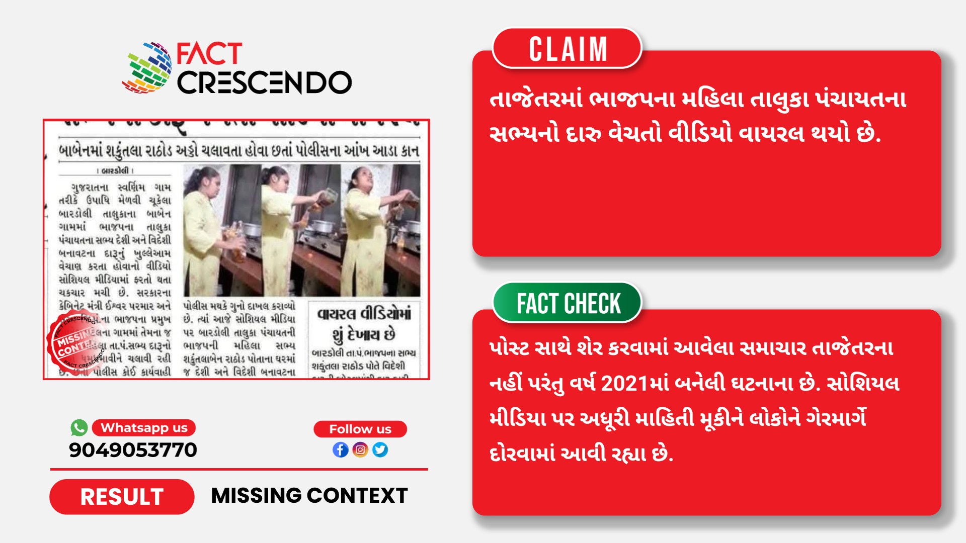 તાજેતરમાં સોશિયલ મીડિયા પર સમાચારપત્રના એક કટિંગમાં ભાજપના મહિલા તાલુકા પંચાયતના સભ્યનો દારુ વેચતો વીડિયો વાયરલ થયો હોવાના સમાચાર પ્રસારિત કરવામાં આવ્યા છે. જેમાં પોસ્ટમાં મૂકવામાં આવેલા ફોટો સાથેના લખાણમાં એવો દાવો કરવામાં આવી રહ્યો છે કે, તાજેતરમાં ભાજપના મહિલા તાલુકા પંચાયતના સભ્યનો દારુ વેચતો વીડિયો વાયરલ થયો છે. પરંતુ ફેક્ટ ક્રેસેન્ડોની પડતાલમાં આ દાવો અધૂરી માહિતી સાથેનો હોવાનું સાબિત થાય છે કારણ કે, પોસ્ટ સાથે શેર કરવામાં આવેલા સમાચાર તાજેતરના નહીં પરંતુ વર્ષ 2021માં બનેલી ઘટનાના છે. સોશિયલ મીડિયા પર અધૂરી માહિતી મૂકીને લોકોને ગેરમાર્ગે દોરવામાં આવી રહ્યા છે.