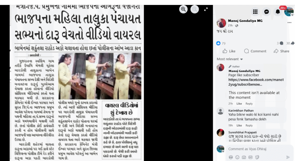 એક સોશિયલ મીડિયા યુઝર દ્વારા 1 ડિસેમ્બર, 2025ના રોજ એક પોસ્ટ શેર કરવામાં આવી હતી. પોસ્ટમાં મૂકવામાં આવેલા ફોટોના લખાણમાં એવો દાવો કરવામાં આવી રહ્યો છે કે, તાજેતરમાં ભાજપના મહિલા તાલુકા પંચાયતના સભ્યનો દારુ વેચતો વીડિયો વાયરલ થયો છે.