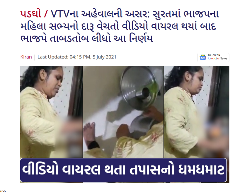 ઉપરોક્ત પોસ્ટમાં કરવામાં આવેલા દાવાની સત્યતા તપાસવી જરૂરી જણાતાં અમે અમારી પડતાલ/તપાસ કાર્યવાહી શરૂ કરી હતી. તપાસની શરૂઆતમાં અમે ગુગલનો સહારો લઈને સર્ચ કરતાં અમને વીટીવી ગુજરાતી દ્વારા પોસ્ટમાં મૂકવામાં આવેલી આ જ માહિતી અને ફોટો સાથેના સમાચાર 5 જુલાઈ, 2021ના રોજ પ્રસારિત કરવામાં આવ્યા હોવાની માહિતી પ્રાપ્ત થઈ હતી. જેમાં એવી માહિતી આપવામાં આવી હતી કે, સુરતના બાબેન ગામમાં ભાજપના મહિલા સભ્ય દ્વારા દારૂના વેચાણના વાયરલ વીડિયોને લઇ VTV એ અહેવાલ પ્રસારિત કર્યો જે બાદ જિલ્લા ભાજપ દોડતું થયું છે. જિલ્લા ભાજપની શિસ્ત સમિતિને આ મામલે તપાસના આદેશ સોંપવામાં આવ્યા છે, તેમજ તપાસ બાદ મહિલા સભ્યને શો-કોઝ નોટિસ આપવામાં આવશે મહત્વનું છે કે પાણીના પાઉંચ વેચાતા હોય તેમ ગુજરાત બાબેન ગામના ભાજપના તાલુકા પંચાયતના સભ્ય ઘરમાંજ ખુલ્લેઆમ દારૂ વેચતા હોય તેવો વીડિયો વાયરલ થયો છે.