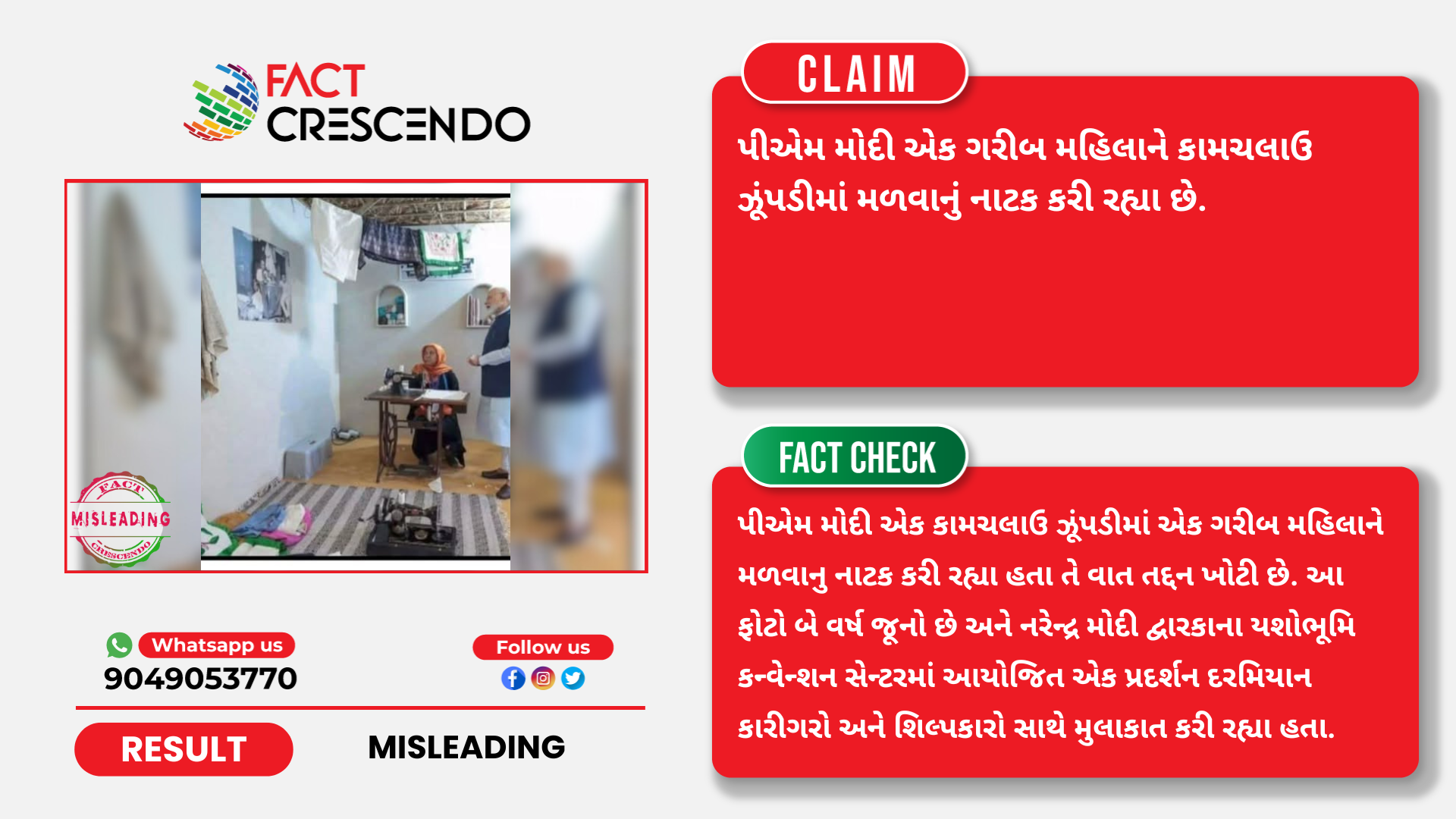 આમ, અમારી પડતાલમાં ઉપરોક્ત પોસ્ટ ખોટી સાબિત થાય છે. કારણ કે, પીએમ મોદી એક કામચલાઉ ઝૂંપડીમાં એક ગરીબ મહિલાને મળવાનુ નાટક કરી રહ્યા હતા તે વાત તદ્દન ખોટી છે. આ ફોટો બે વર્ષ જૂનો છે અને નરેન્દ્ર મોદી દ્વારકાના યશોભૂમિ કન્વેન્શન સેન્ટરમાં આયોજિત એક પ્રદર્શન દરમિયાન કારીગરો અને શિલ્પકારો સાથે મુલાકાત કરી રહ્યા હતા.