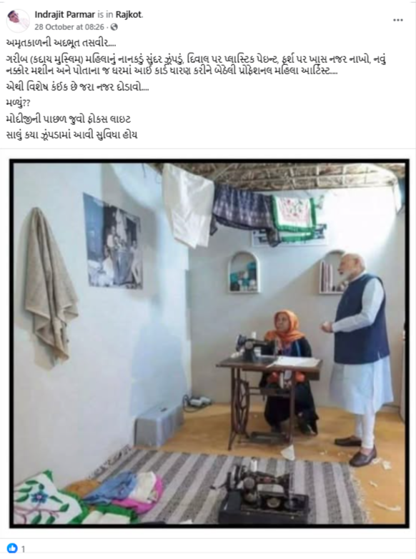 સોશિયલ મીડિયા યુઝર્સ દ્વારા તારીખ 28 ઓક્ટોબર 2025ના એક પોસ્ટ શેર કરવામાં આવી હતી. આ પોસ્ટમાં દાવો કરવામાં આવ્યો હતો કે, “પીએમ મોદી એક ગરીબ મહિલાને કામચલાઉ ઝૂંપડીમાં મળવાનું નાટક કરી રહ્યા છે.”