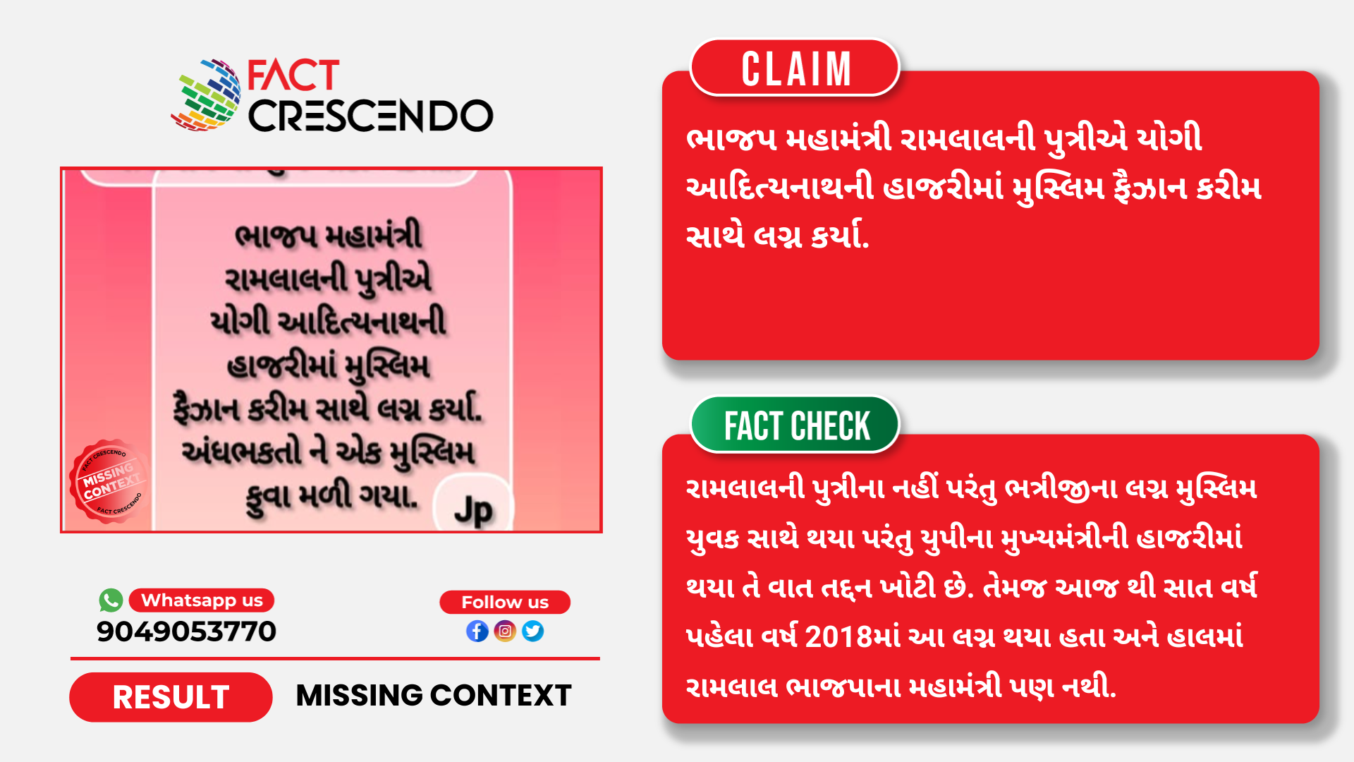 હાલમાં સોશિયલ મીડિયા પર એક મેસેજ ખૂબ જ વાયરલ થઈ રહ્યો છે. જેની સાથે માહિતી આપવામાં આવી હતી કે, “ભાજપ મહામંત્રી રામલાલની પુત્રીએ યોગી આદિત્યનાથની હાજરીમાં મુસ્લિમ ફૈઝાન કરીમ સાથે લગ્ન કર્યા. અંધભક્તો ને એક મુસ્લિમ ફુવા મળી ગયા.”
