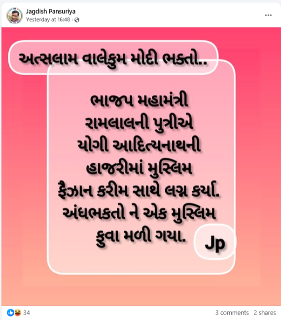સોશિયલ મીડિયા યુઝર્સ દ્વારા તારીખ 01 ડિસેમ્બર 2025ના એક પોસ્ટ શેર કરવામાં આવી હતી. આ પોસ્ટમાં દાવો કરવામાં આવ્યો હતો કે, “ભાજપ મહામંત્રી રામલાલની પુત્રીએ યોગી આદિત્યનાથની હાજરીમાં મુસ્લિમ ફૈઝાન કરીમ સાથે લગ્ન કર્યા.”