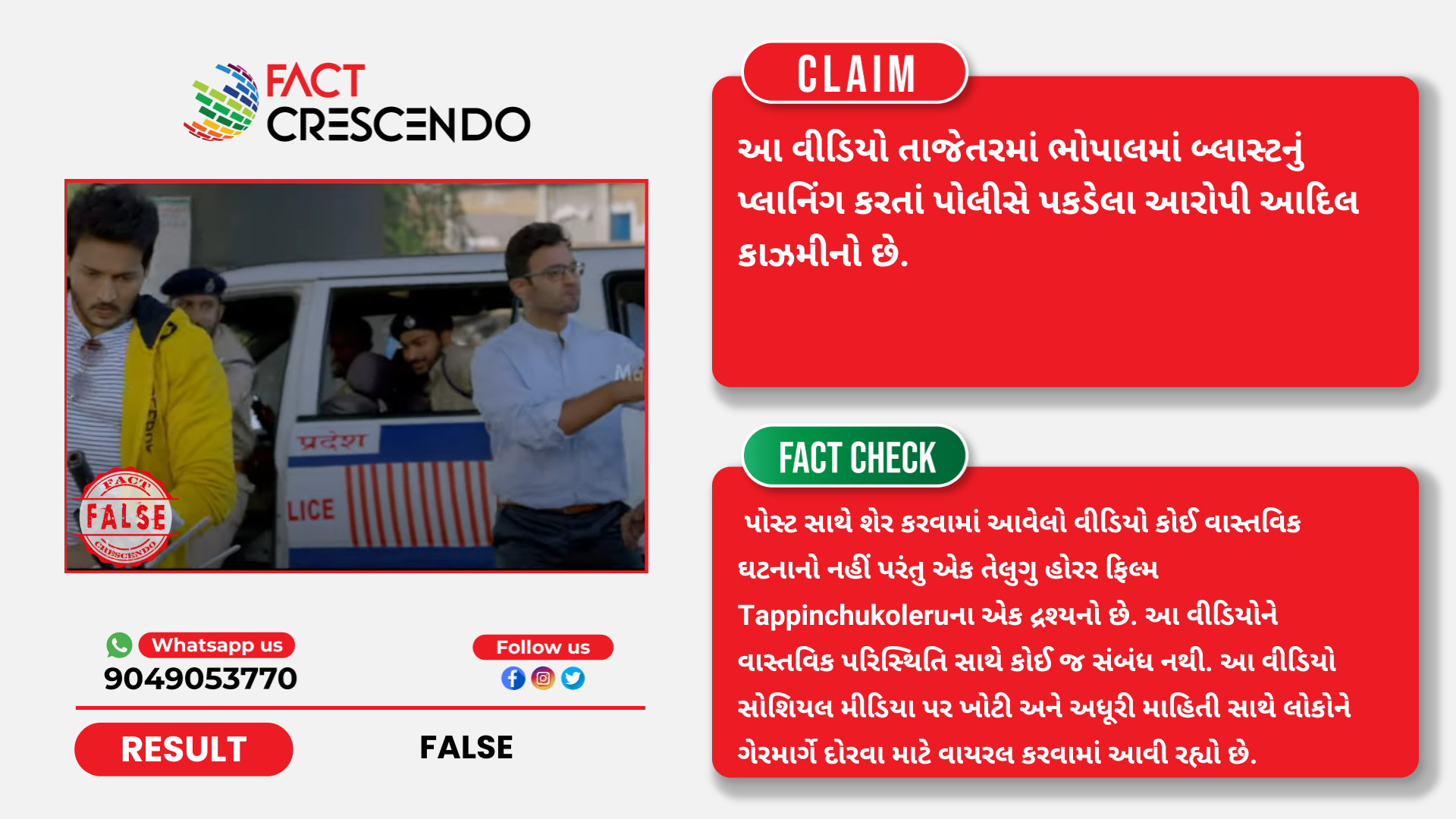 તાજેતરમાં સોશિયલ મીડિયા પર પેલીસ દ્વારા પકડવામાં આવેલા એક યુવકનો વીડિયો વાયરલ થઈ રહ્યો છે જેની સાથે એવો દાવો કરવામાં આવી રહ્યો છે કે, આ વીડિયો તાજેતરમાં ભોપાલમાં બ્લાસ્ટનું પ્લાનિંગ કરતાં પોલીસે પકડેલા આરોપી આદિલ કાઝમીનો છે. પરંતુ ફેક્ટ ક્રેસેન્ડોની પડતાલમાં આ દાવો ખોટો હોવાનું સાબિત થાય છે કારણ કે, પોસ્ટ સાથે શેર કરવામાં આવેલો વીડિયો કોઈ વાસ્તવિક ઘટનાનો નહીં પરંતુ એક તેલુગુ હોરર ફિલ્મ Tappinchukoleruના એક દ્રશ્યનો છે. આ વીડિયોને વાસ્તવિક પરિસ્થિતિ સાથે કોઈ જ સંબંધ નથી. આ વીડિયો સોશિયલ મીડિયા પર ખોટી અને અધૂરી માહિતી સાથે લોકોને ગેરમાર્ગે દોરવા માટે વાયરલ કરવામાં આવી રહ્યો છે.
