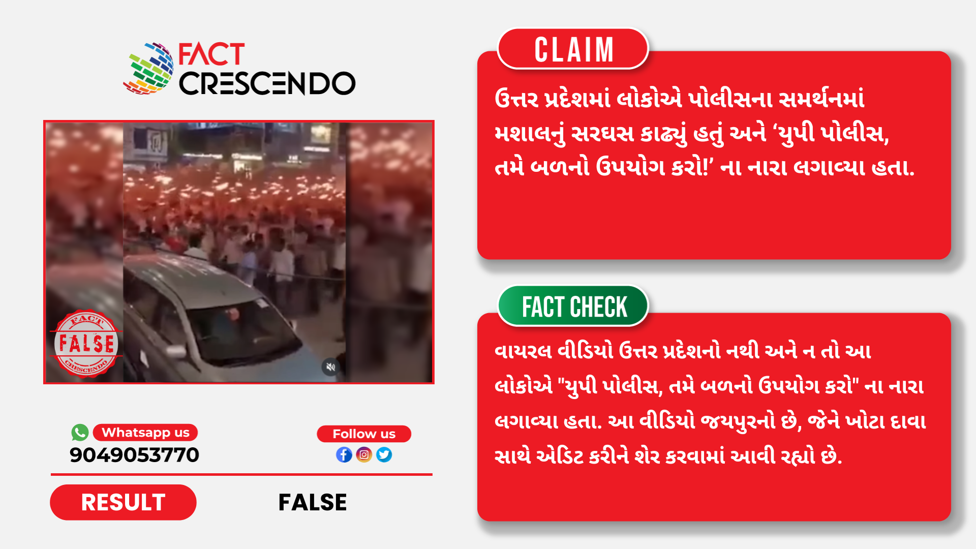 વાયરલ વીડિયો ઉત્તર પ્રદેશનો નથી અને ન તો આ લોકોએ “યુપી પોલીસ, તમે બળનો ઉપયોગ કરો” ના નારા લગાવ્યા હતા. આ વીડિયો જયપુરનો છે, જેને ખોટા દાવા સાથે એડિટ કરીને શેર કરવામાં આવી રહ્યો છે.