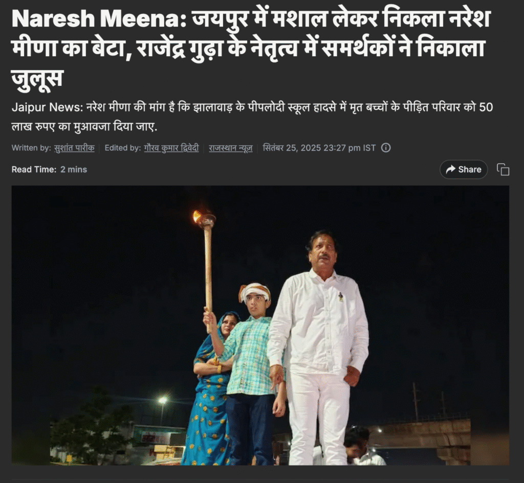 અમને મળેલી માહિતીનો ઉપયોગ કરીને, અમે વધુ શોધખોળ હાથ ધરી અને NDTVનો એક અહેવાલ મળ્યો. અહેવાલ મુજબ, આ સરઘસ 25 સપ્ટેમ્બરના રોજ રાજસ્થાનના યુવા નેતા નરેશ મીણાના સમર્થકો દ્વારા કાઢવામાં આવ્યું હતું. તે સમયે મીણા 14 દિવસથી ભૂખ હડતાળ પર હતા.