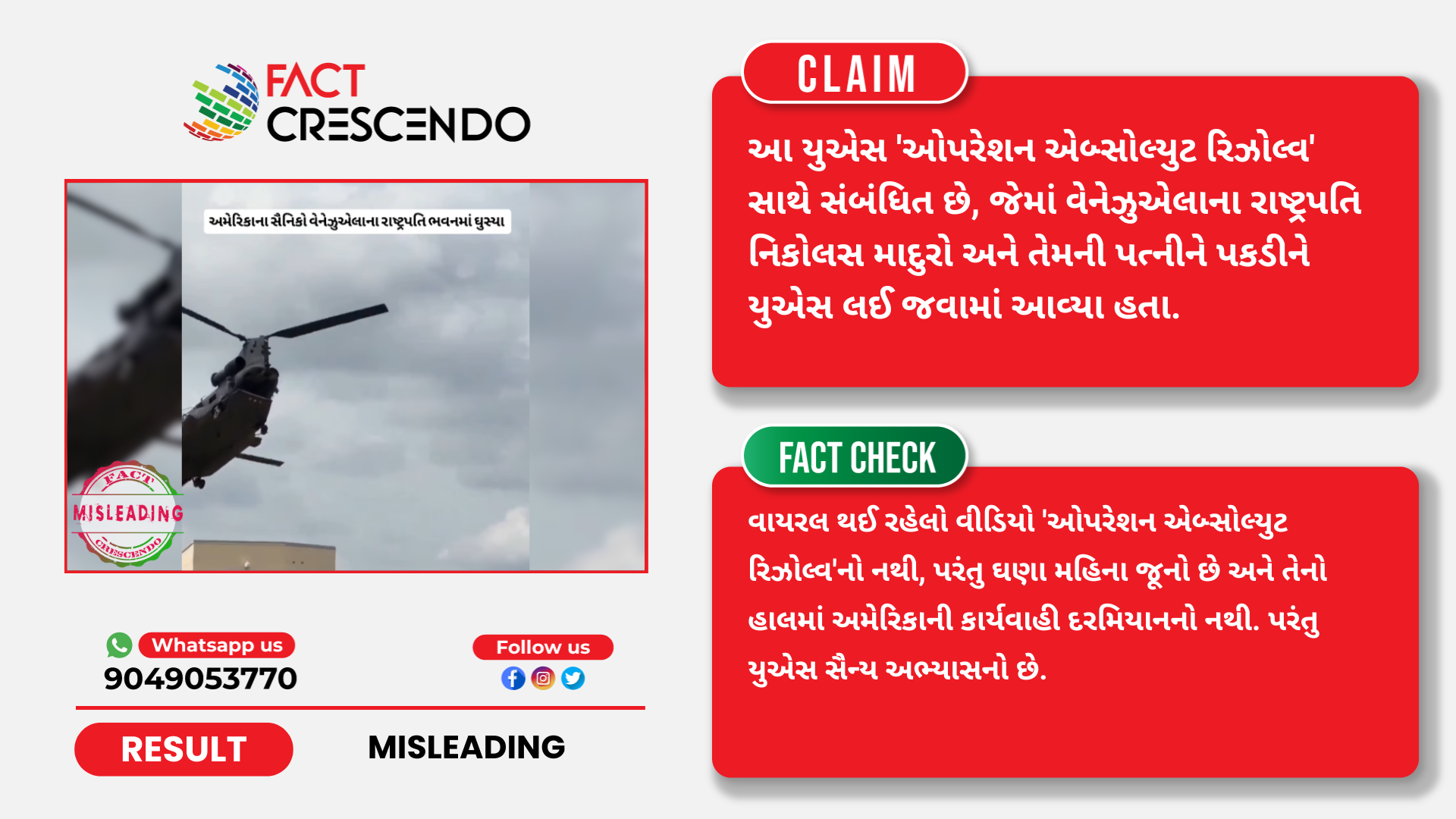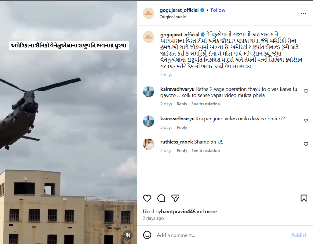 આમ, અમારી પડતાલમાં ઉપરોક્ત પોસ્ટ ખોટી સાબિત થાય છે. કારણ કે, વાયરલ થઈ રહેલો વીડિયો ‘ઓપરેશન એબ્સોલ્યુટ રિઝોલ્વ’નો નથી, પરંતુ ઘણા મહિના જૂનો છે અને તેનો હાલમાં અમેરિકાની કાર્યવાહી દરમિયાનનો નથી. પરંતુ યુએસ સૈન્ય અભ્યાસનો છે.