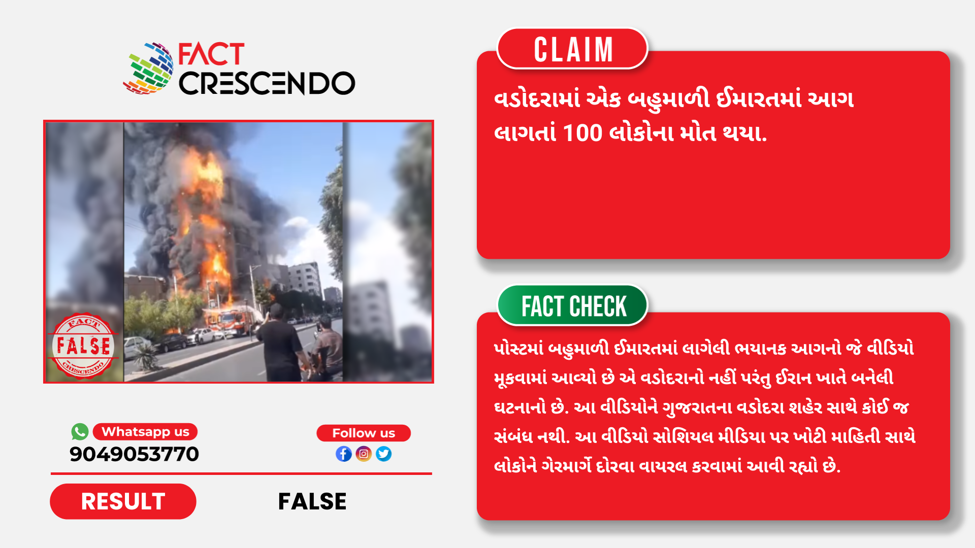 તાજેતરમાં સોશિયલ મીડિયા પર એક બહુમાળી ઈમારતમાં લાગેલી ભયાનક આગનો એક વીડિયો વાયરલ થઈ રહ્યો છે જેની સાથે એવો દાવો કરવામાં આવી રહ્યો છે કે, વડોદરામાં એક બહુમાળી ઈમારતમાં આગ લાગતાં 100 લોકોના મોત થયા. પરંતુ ફેક્ટ ક્રેસેન્ડોની પડતાલમાં આ દાવો ખોટો અને પાયાવિહોણો હોવાનું સાબિત થાય છે કારણ કે, પોસ્ટમાં બહુમાળી ઈમારતમાં લાગેલી ભયાનક આગનો જે વીડિયો મૂકવામાં આવ્યો છે એ વડોદરાનો નહીં પરંતુ ઈરાન ખાતે બનેલી ઘટનાનો છે. આ વીડિયોને ગુજરાતના વડોદરા શહેર સાથે કોઈ જ સંબંધ નથી. આ વીડિયો સોશિયલ મીડિયા પર ખોટી માહિતી સાથે લોકોને ગેરમાર્ગે દોરવા વાયરલ કરવામાં આવી રહ્યો છે.