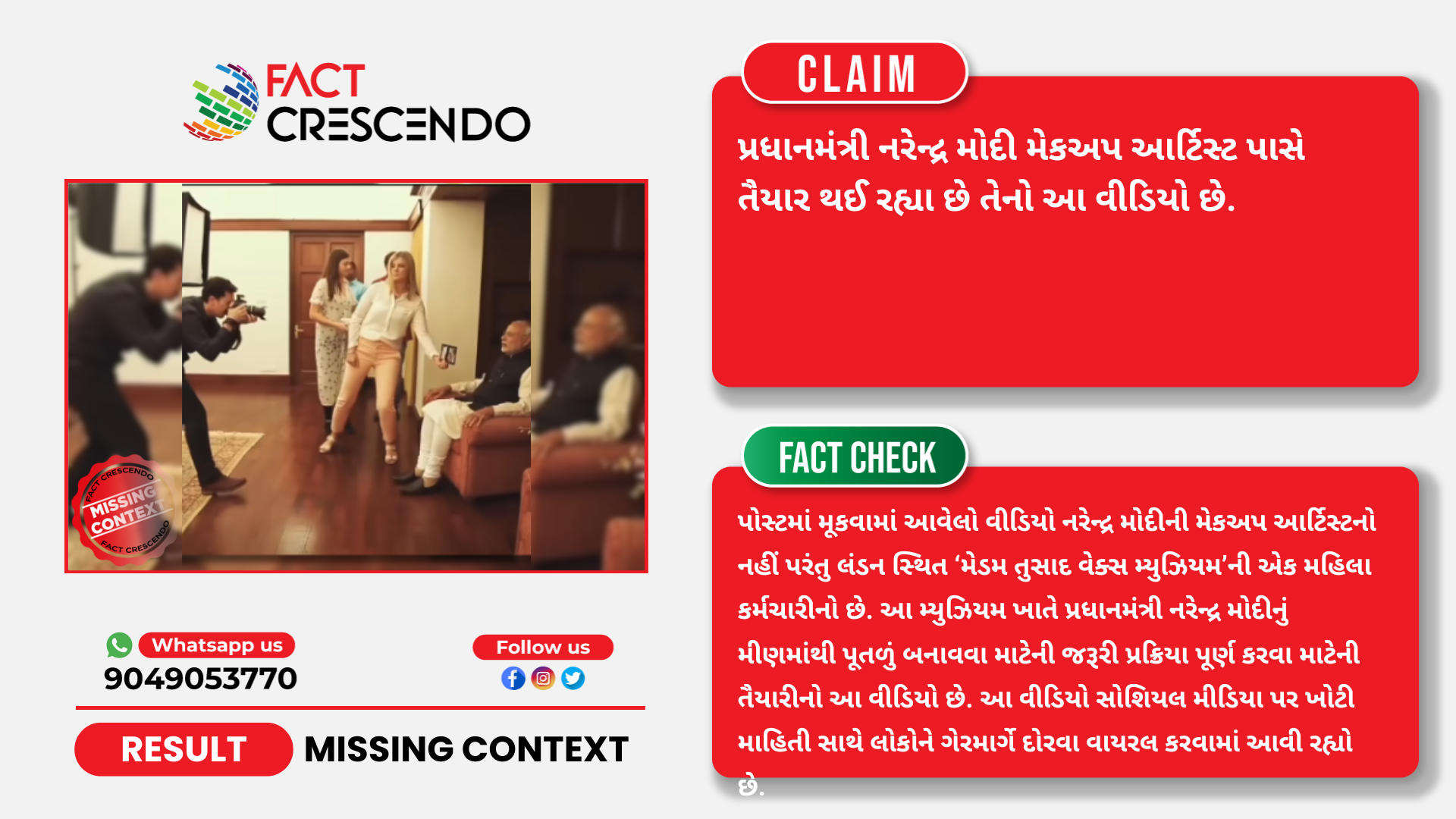 તાજેતરમાં સોશિયલ મીડિયા પર વડાપ્રધાન નરેન્દ્ર મોદીને મેકઅપ કરી રહેલી મહિલાનો એક વીડિયો વાયરલ થઈ રહ્યો છે. જેની સાથે એવો દાવો કરવામાં આવી રહ્યો છે કે, પ્રધાનમંત્રી નરેન્દ્ર મોદી મેકઅપ આર્ટિસ્ટ પાસે તૈયાર થઈ રહ્યા છે તેનો આ વીડિયો છે. પરંતુ ફેક્ટ ક્રેસેન્ડોની પડતાલમાં આ દાવો ખોટો અને પાયાવિહોણો હોવાનું સાબિત થાય છે કારણ કે, પોસ્ટમાં મૂકવામાં આવેલો વીડિયો નરેન્દ્ર મોદીની મેકઅપ આર્ટિસ્ટનો નહીં પરંતુ લંડન સ્થિત ‘મેડમ તુસાદ વેક્સ મ્યુઝિયમ’ની એક મહિલા કર્મચારીનો છે. આ મ્યુઝિયમ ખાતે પ્રધાનમંત્રી નરેન્દ્ર મોદીનું મીણમાંથી પૂતળું બનાવવા માટેની જરૂરી પ્રક્રિયા પૂર્ણ કરવા માટેની તૈયારીનો આ વીડિયો છે. આ વીડિયો સોશિયલ મીડિયા પર ખોટી માહિતી સાથે લોકોને ગેરમાર્ગે દોરવા વાયરલ કરવામાં આવી રહ્યો છે.