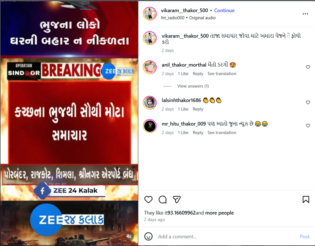 જે 10 મે 2025ના અપલોડ કરવામાં આવ્યુ હતુ. જેની સાથે માહિતી આપવામાં આવી હતી કે, “કચ્છમાં પાકિસ્તાનનું નાપાક કૃત્ય, સરહદી વિસ્તારના ગામડાઓ પર કરેલા 6 ડ્રોન હુમલા કરાયા નાકામ, કચ્છના ભુજમાં વાગી સાયરન, લોકોને ઘરની બહાર ન નીકળવા અપીલ…..”
