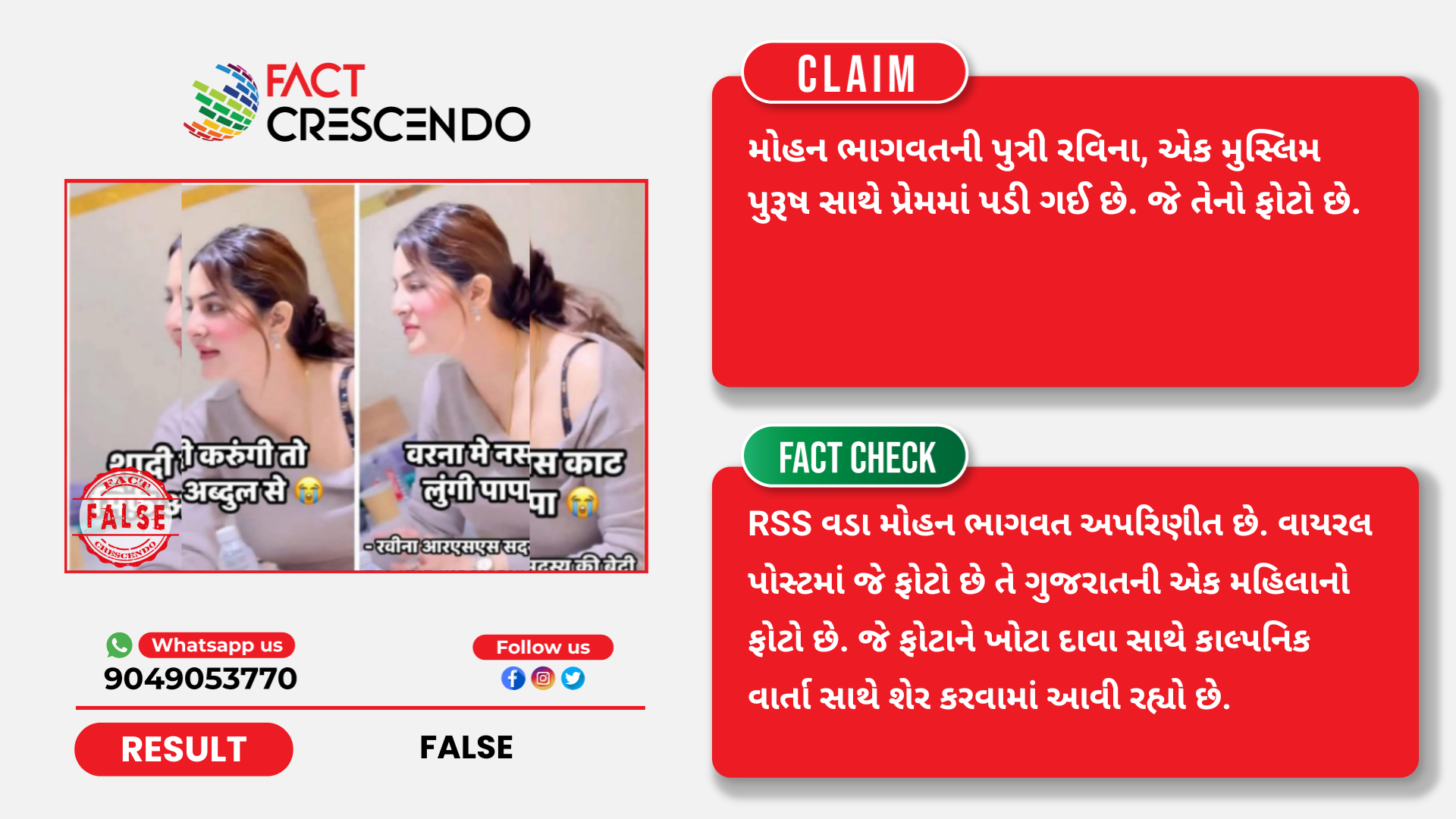 રાષ્ટ્રીય સ્વયંસેવક સંઘના વડા મોહન ભાગવતની કથિત પુત્રીના નામે એક પોસ્ટ સોશિયલ મીડિયા પર વાયરલ થઈ રહી છે. એક મહિલાના ફોટાનો ઉપયોગ કરીને, દાવો કરવામાં આવ્યો છે કે, “મોહન ભાગવતની પુત્રી રવિના, એક મુસ્લિમ પુરૂષ સાથે પ્રેમમાં પડી ગઈ છે. જે તેનો ફોટો છે.”