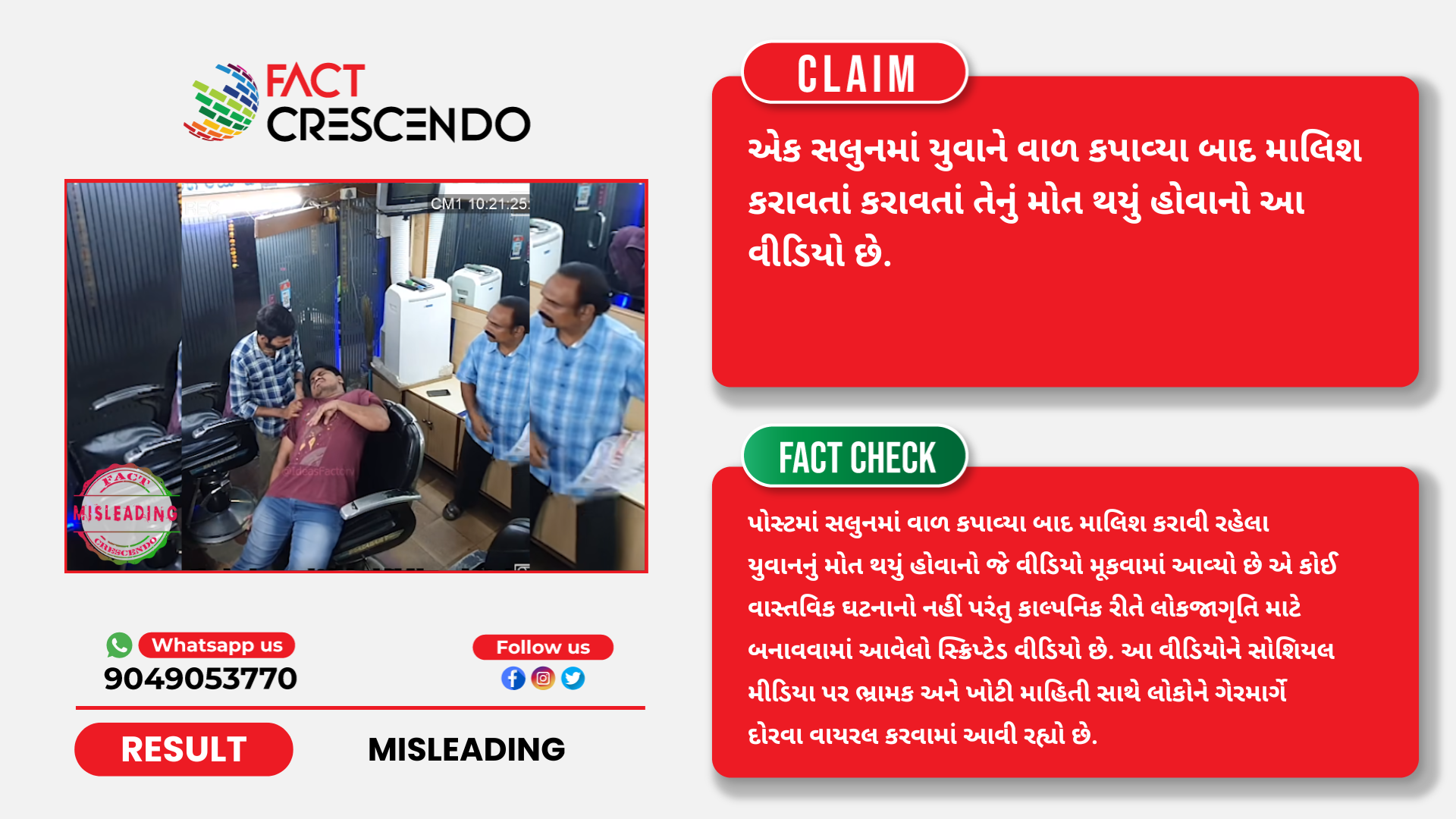 તાજેતરમાં સોશિયલ મીડિયા પર સલુનમાં માથાનો મસાજ કરાવી રહેલા યુવાનું મોત થયું હોવાનો એક વીડિયો વાયરલ થઈ રહ્યો છે. આ વીડિયો સાથેના લખાણમાં એવો દાવો કરવામાં આવી રહ્યો છે કે, એક સલુનમાં યુવાને વાળ કપાવ્યા બાદ માલિશ કરાવતાં કરાવતાં તેનું મોત થયું હોવાનો આ વીડિયો છે પરંતુ ફેક્ટ ક્રેસેન્ડોની પડતાલમાં આ દાવો ખોટો અને પાયાવિહોણો હોવાનું સાબિત થાય છે કારણ કે, પોસ્ટમાં સલુનમાં વાળ કપાવ્યા બાદ માલિશ કરાવી રહેલા યુવાનનું મોત થયું હોવાનો જે વીડિયો મૂકવામાં આવ્યો છે એ કોઈ વાસ્તવિક ઘટનાનો નહીં પરંતુ કાલ્પનિક રીતે લોકજાગૃતિ માટે બનાવવામાં આવેલો સ્ક્રિપ્ટેડ વીડિયો છે. આ વીડિયોને સોશિયલ મીડિયા પર ભ્રામક અને ખોટી માહિતી સાથે લોકોને ગેરમાર્ગે દોરવા વાયરલ કરવામાં આવી રહ્યો છે.