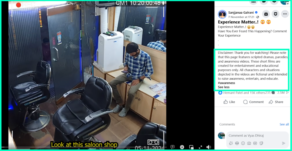 ઉપરોક્ત વીડિયોની નીચે પણ એવી માહિતી આપવામાં આવી છે કે, જોવા માટે આભાર! મહેરબાની કરીને નોંધ કરો કે આ પૃષ્ઠ પર સ્ક્રિપ્ટેડ નાટકો, પેરોડીઝ અને જાગૃતિ વીડીયો છે. આ ટૂંકી ફિલ્મો માત્ર મનોરંજન અને શૈક્ષણિક હેતુઓ માટે બનાવવામાં આવી છે. વીડિયોમાં દર્શાવવામાં આવેલા તમામ પાત્રો અને પરિસ્થિતિઓ કાલ્પનિક છે અને તેનો હેતુ જાગૃતિ, મનોરંજન અને શિક્ષિત કરવાનો છે.