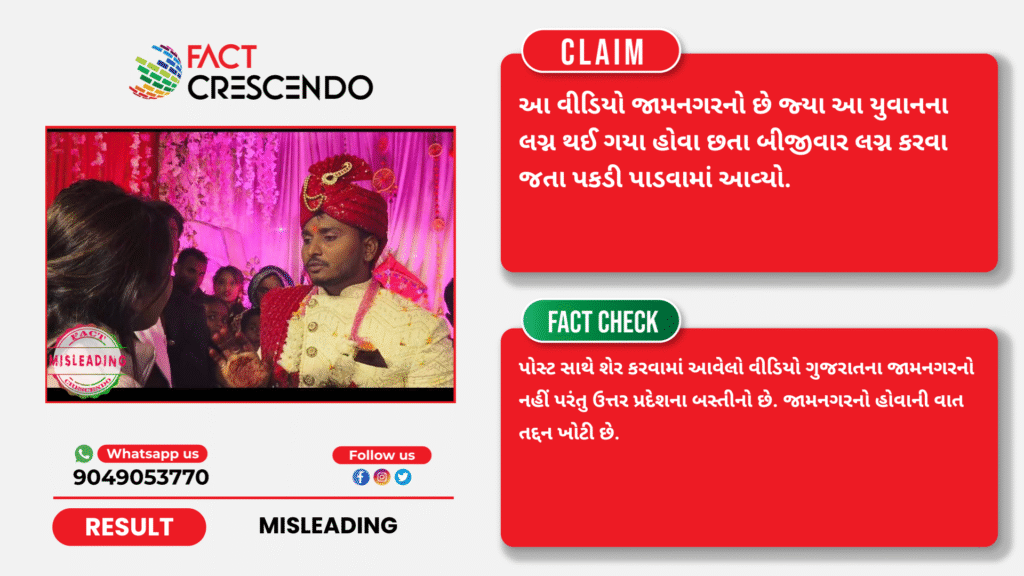 સોશિયલ મીડિયા યુઝર્સ દ્વારા તારીખ 20 નવેમ્બર 2025ના એક પોસ્ટ શેર કરવામાં આવી હતી. આ પોસ્ટમાં દાવો કરવામાં આવ્યો હતો કે, “આ વીડિયો જામનગરનો છે જ્યા આ યુવાનના લગ્ન થઈ ગયા હોવા છતા બીજીવાર લગ્ન કરવા જતા પકડી પાડવામાં આવ્યો.”