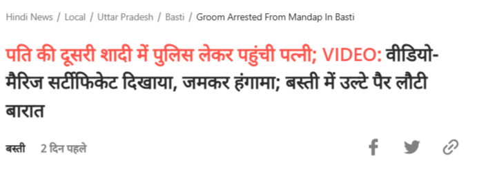 તેમજ વધુ સર્ચ કરતા અમને દૈનિક ભાસ્કર દ્વારા પ્રસારિત એક અહેવાલ પ્રાપ્ત થયો હતો. જેની સાથે માહિતી આપવામાં આવી હતી કે, “ઉત્તર પ્રદેશના બસ્તીમાં, બીજા લગ્ન કરવા જઈ રહેલા એક પુરુષની પત્નીએ ભારે હંગામો મચાવ્યો. તેણીએ પોલીસ સાથે સમારંભમાં ધસી આવી. જ્યારે માળા ચઢાવવાની વિધિ ચાલી રહી હતી, ત્યારે મહિલાએ વરરાજા પર પરિણીત હોવાનો આરોપ લગાવીને હોબાળો મચાવ્યો. તે રડી પડી. કન્યાના પરિવારે તેણીને શાંત પાડી. કારણ પૂછતાં તેણે કહ્યું, ‘મારા લગ્ન ત્રણ વર્ષ પહેલાં આ પુરુષ સાથે થયા હતા. મારી પાસે લગ્નના ફોટા, વીડિયો અને લગ્ન નોંધણી પ્રમાણપત્ર છે.’”